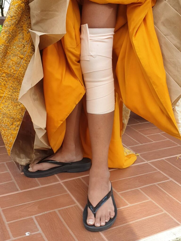 พอผู้กำกับฯ (น้าหมู วลงกรณ์) สั่งคัท หญิงกำลังจะลุกขึ้น เข่าก็ทรุดลงเลย แล้วเสียงดังก๊อก คือเหมือนเข่าหลุด เข่าห้อยเลย งอเข่าไม่ได้ ลุกขึ้นยืนไม่ได้ ทีมงานก็ไม่กล้ามาแตะ เกรงว่าจะเกิดอันตราย แล้วหญิงก็ลุกไม่ได้เลย เจ็บมากด้วย ทีมงานก็เลยอุ้มนำส่งโรงพยาบาลที่ใกล้ที่สุด คือตอนนั้นคิดว่า เข่าหลุดแน่ๆ ถ้าหลุดแล้วทำไง จะทำงานได้มั้ย ใจหายเลย เกือบร้องไห้ กลัวทำงานหาเงินไม่ได้ เพราะหญิงก็ยังต้องฟอกเลือดอยู่ตลอด ทุกวันนี้มีรายได้จากการขายน้ำส้ม และถ่ายละครบ้าง ถ้าเกิดบาดเจ็บ จนทำงานไม่ได้ต้องแย่แน่ๆ เลยค่ะ แต่โชคดีที่แค่เข่าฉีก หมอบอกมีเลือดออกนิดหน่อย ทำให้เจ็บ จ่ายยาแก้ปวดมาทานที่บ้าน พอยืนได้ ก็ต้องเข้าฉากถ่ายละครต่อ เพราะตัวปทุมมาต้องประกบกับ นางวิสาขา ตลอด ก็สู้ตาย เพื่องานที่เรารักค่ะ”