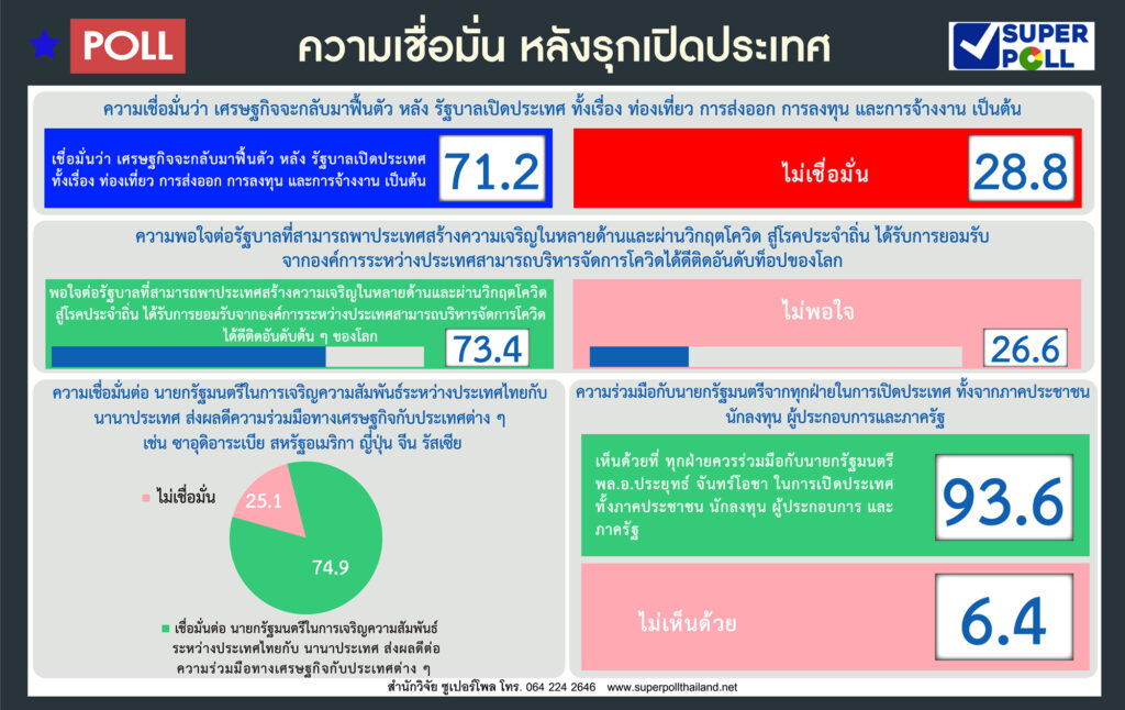SUPER โพล คนพอใจแก้โควิดสู่โรคประจำถิ่น หวังเปิดประเทศ ฟื้นเศรษฐกิจ เชื่อมั่นนายกฯ คุยต่างประเทศลุยลงทุน