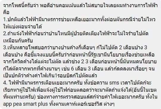 ซึ่งหลังจากเรื่องราวได้ถูกเผยแพร่ออกไป พนักงานการไฟฟ้าคนหนึ่งได้ออกมาชี้แจงถึงเหตุการณ์การตัดไฟที่เกิดขึ้นแล้ว แต่ยังมีประชาชนอีกหลายคนไม่พอใจและได้เข้ามาคอมเมนต์เพิ่มเติมถึงประสบการณ์การถูกตัดไฟ และวิพากษ์วิจารณ์กันอย่างต่อเนื่อง
