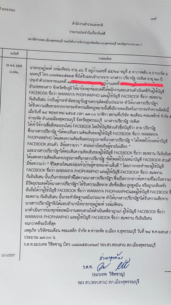 ล่าสุด “อาย ปรียานัฐ” ไม่ทนอีกต่อไป ส่งทนายแจ้งความลงบันทึกประจำวัน หลังเจอชาวเน็ตรายหนึ่งคอมเมนต์แรงว่า “สวยอย่างไทยกินผู้ชายไม่เลือก” และยังมีอีกรายหนึ่งที่โพสต์ว่า “ชีวิตสดใส ย่องเข้าบ้านผู้ชาย หน้าด้านสิ้นดี “