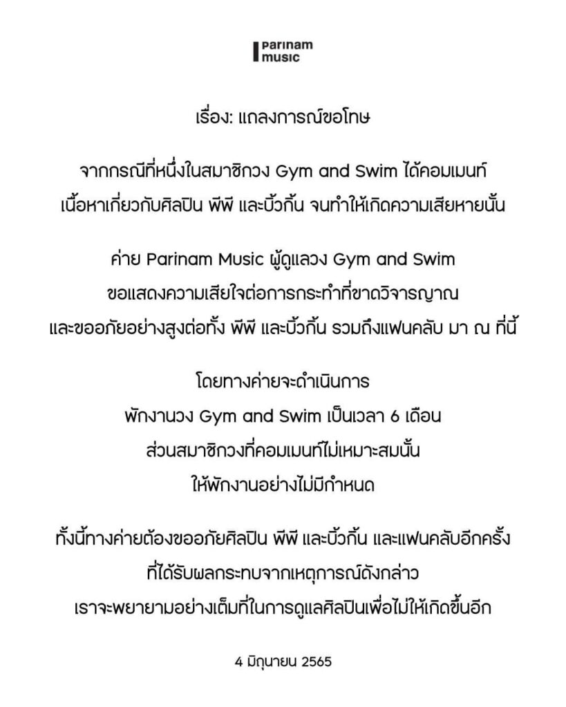 ล่าสุดค่าย Parinam Music ต้นสังกัดของวง Gym and Swim ได้ออกแถลงการณ์ ระบุว่า…แถลงการณ์ขอโทษ จากกรณีที่หนึ่งในสมาชิกวง Gym and Swim ได้คอมเมนท์ เนื้อหาเกี่ยวกับศิลปิน พีพี และบิวกิ้น จนทำให้เกิดความเสียหายนั้น ค่าย Parinam Music ผู้ดูแลวง Gym and Swim ขอแสดงความเสียใจต่อการกระทำที่ขาดวิจารญาณ และขออภัยอย่างสูงต่อทั้ง พีพี และบิวกิ้น รวมถึงแฟนคลับ มา ณ ที่นี้