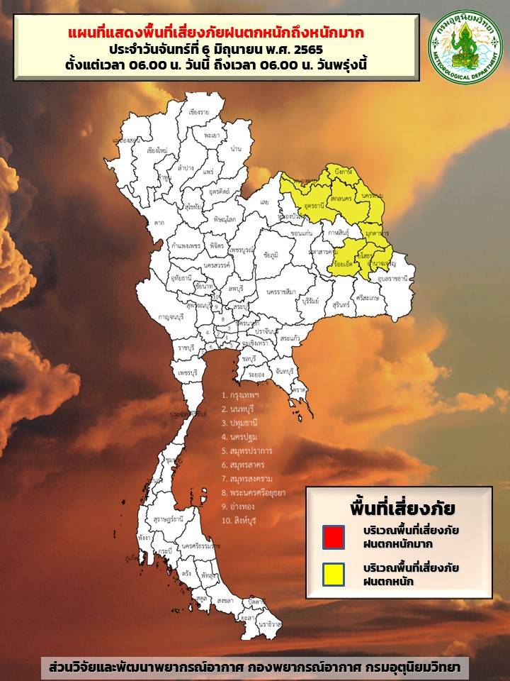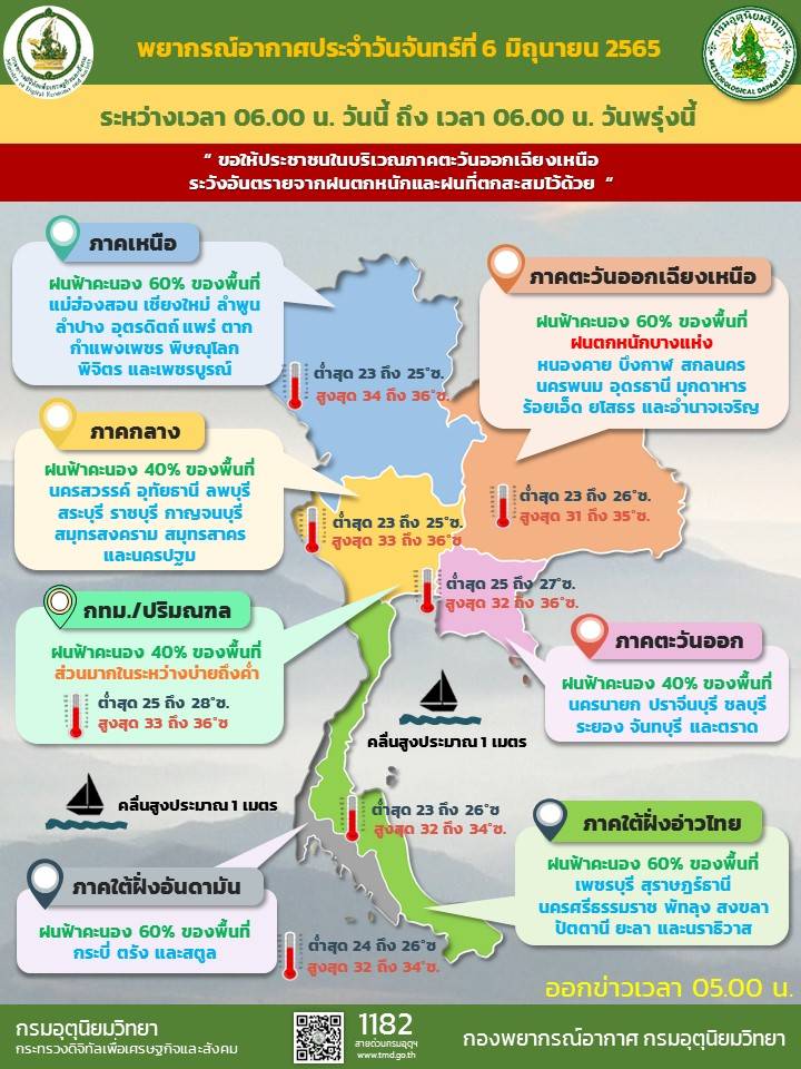 พยากรณ์อากาศ ประจำวันที่ 6 มิถุนายน 2565 ลักษณะอากาศทั่วไป 24 ชั่วโมงข้างหน้า มรสุมตะวันตกเฉียงใต้กำลังปานกลางพัดปกคลุมทะเลอันดามัน ประเทศไทย และอ่าวไทย ในขณะที่มีหย่อมความกดอากาศต่ำปกคลุมประเทศเวียดนามตอนบนและอ่าวตังเกี๋ย