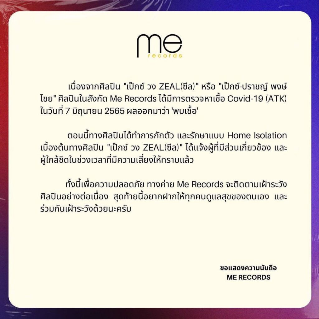 “เนื่องจากศิลปิน “เป๊กซ์ วง ZEAL (ซีล)” หรือ “เป๊กซ์-ปราชญ์ พงษ์ไชย” ศิลปินในสังกัด Me Records ได้มีการตรวจหาเชื้อ Covid-19 (ATK)ในวันที่ 7 มิถุนายน 2565 ผลออกมาว่า ‘พบเชื้อ’ตอนนี้ทางศิลปินได้ทำการกักตัว และรักษาแบบ Home Isolation