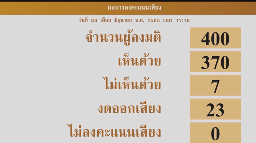 ที่ประชุมสภาผู้แทนราษฎร มีมติเสียงข้างมาก ด้วยคะแนน เห็นด้วย 370 เสียง ไม่เห็นด้วย 7 เสียง งดออกเสียง 23 เสียง ไม่ลงคะแนน 0 เสียงรับหลักการร่างพระราชบัญญัติกัญชง-กัญชา