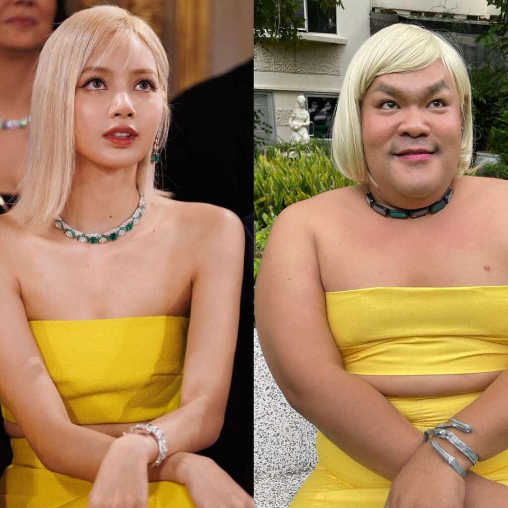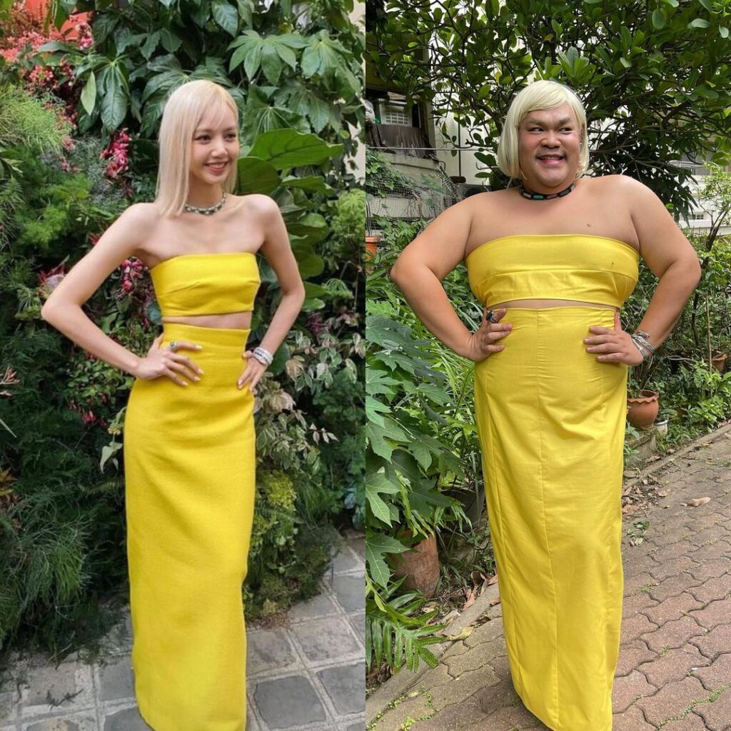 กระแสแรงเกินต้านขนาดนี้ งานนี้ “ปิงปอง ธงชัย หรือ ปิงปอง ไดอารี่ ตุ๊ดซี่” ไม่รอช้า ไวยิ่งกว่า 5G รีบแต่งองค์ทรงเครื่อง จัดเดรสเกาะอกสีเหลืองมาใส่เทียบทันที ไม่หมดเพียงเท่านี้ คัฟเวอร์เป๊ะยันทรงผม แท็กตรงถึงสาว “ลิซ่า” แถมยืนโพทท่าเหมือนยันเงา ไม่เหมือนตรงไหน เอาปากกามาวงเลยจ้า