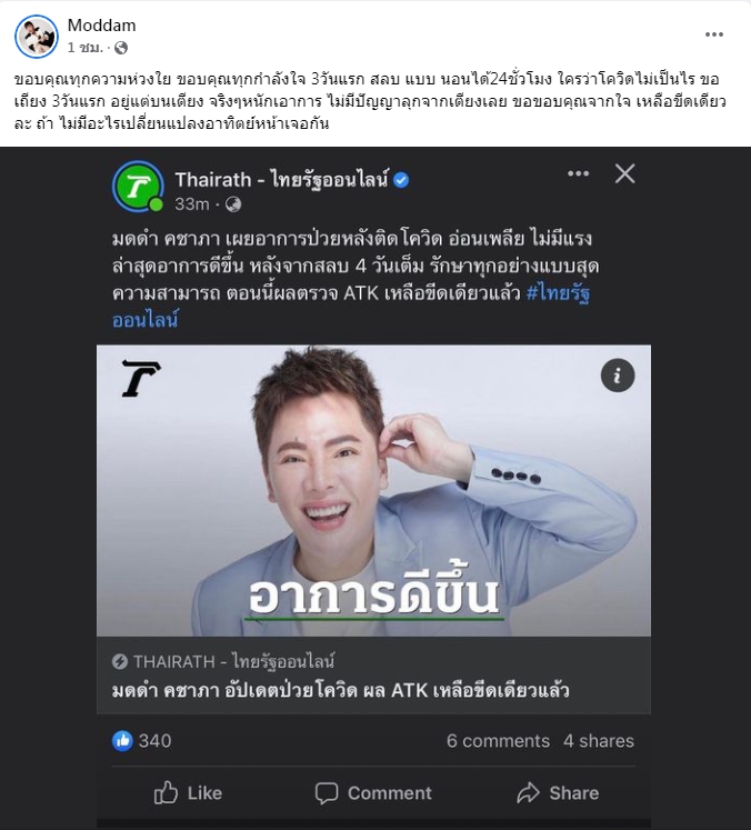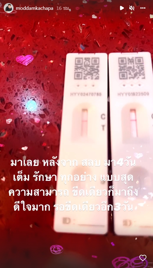 ซึ่งล่าสุด“มดดำ คชาภา” ได้เคลื่อนไหวทางไอจีสตอรี่อีกครั้ง ด้ายการโชว์ผลตรวจ ATK ที่เหลือเพียง 1 ขีด พร้อมกับระบุข้อความว่า… “มาเลย หลังจากสลบมา 4 วันเต็ม รักษาทุกอย่างแบบสุดความสามารถ ขีดเดียวก็มาถึง ดีใจมาก รอขีดเดียวอีก 3 วัน”