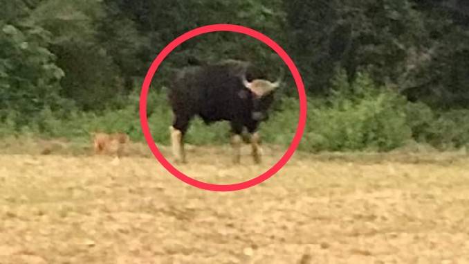 ครั้งแรกเมื่อ 2 วันก่อน กระทิงป่าตัวนี้จะกระทิงป่าตัวดังกล่าวได้ออกมาหากินที่บริเวณเดิมช่วงเช้าและเย็น จะเดินลัดเลาะคลองระเบาะแฝกขึ้นมาหากินหญ้าที่ชายทุ่งนา โดยใช้เวลาหากินหญ้าที่ชายทุ่งนานกว่า 20 นาที แล้วก็หนีสุนัขที่พากันเห่ากลับเข้าป่าไป