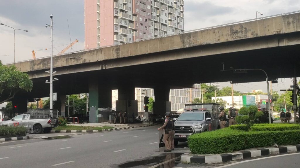 โดยมีกำลังเจ้าหน้าที่ตำรวจคอยดูแลด้านความสงบเรียบร้อยทุกเส้นทาง บริเวณโดยรอบแยกสามเหลี่ยมดินแดง 6 กองร้อย ซึ่งเจ้าหน้าที่ได้มีการยืนในจุดที่มวลชนรวมตัวกันบริเวณจุดกลับรถใต้ทางด่วน และบริเวณหน้าซอยเกล้าสยามคอนโด