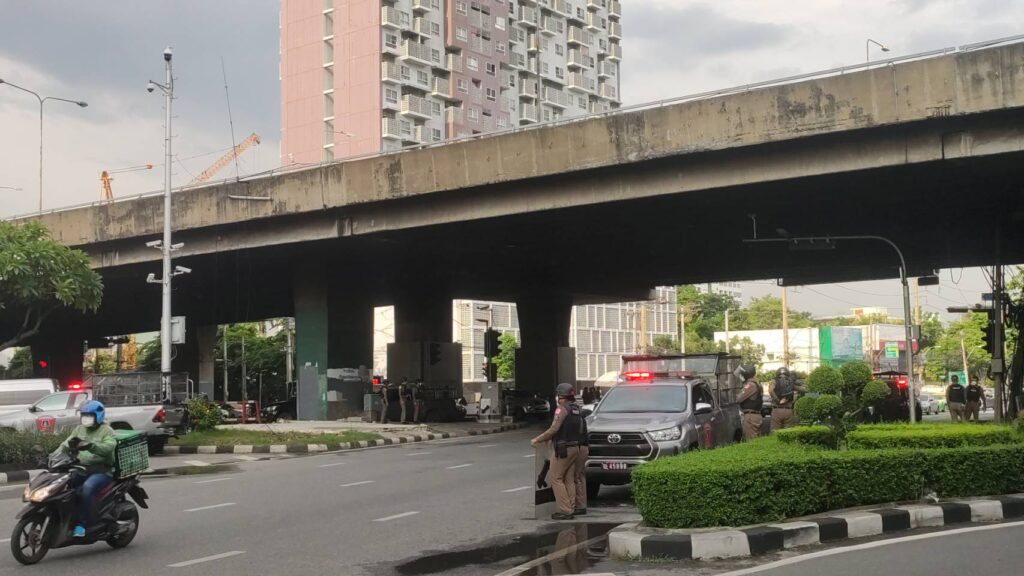 โดยมีกำลังเจ้าหน้าที่ตำรวจคอยดูแลด้านความสงบเรียบร้อยทุกเส้นทาง บริเวณโดยรอบแยกสามเหลี่ยมดินแดง 6 กองร้อย ซึ่งเจ้าหน้าที่ได้มีการยืนในจุดที่มวลชนรวมตัวกันบริเวณจุดกลับรถใต้ทางด่วน และบริเวณหน้าซอยเกล้าสยามคอนโด