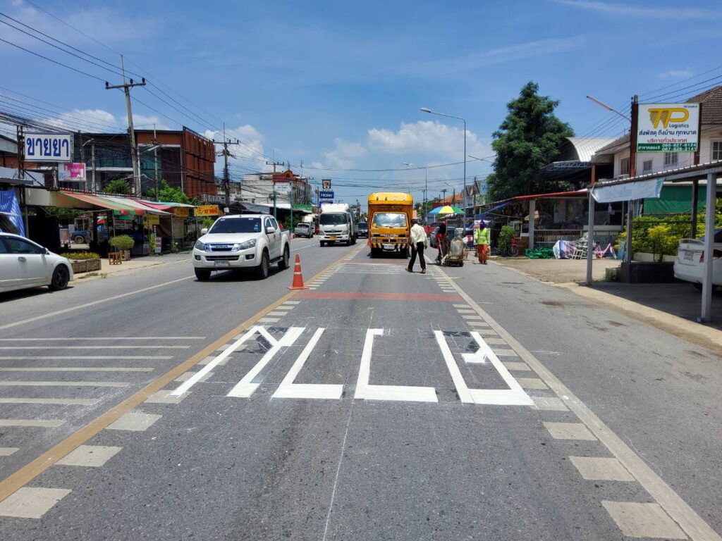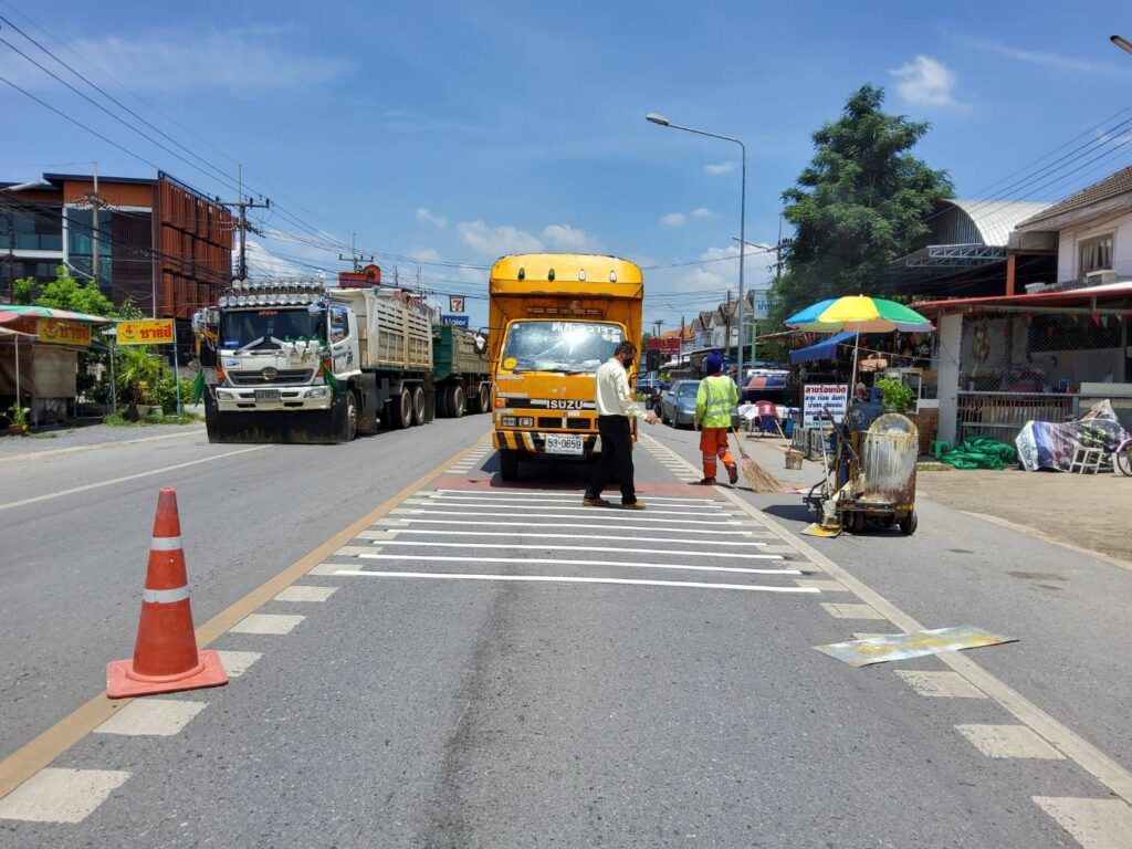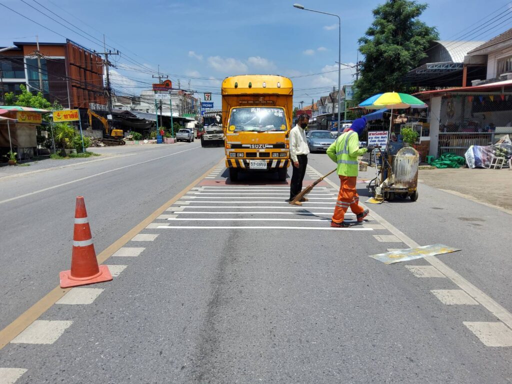 ปทุมธานีทางหลวงชนบทปรับปรุงทางม้าลายบนท้องถนนพร้อมสัญญาณเตือนเขตรร.เจริญดี