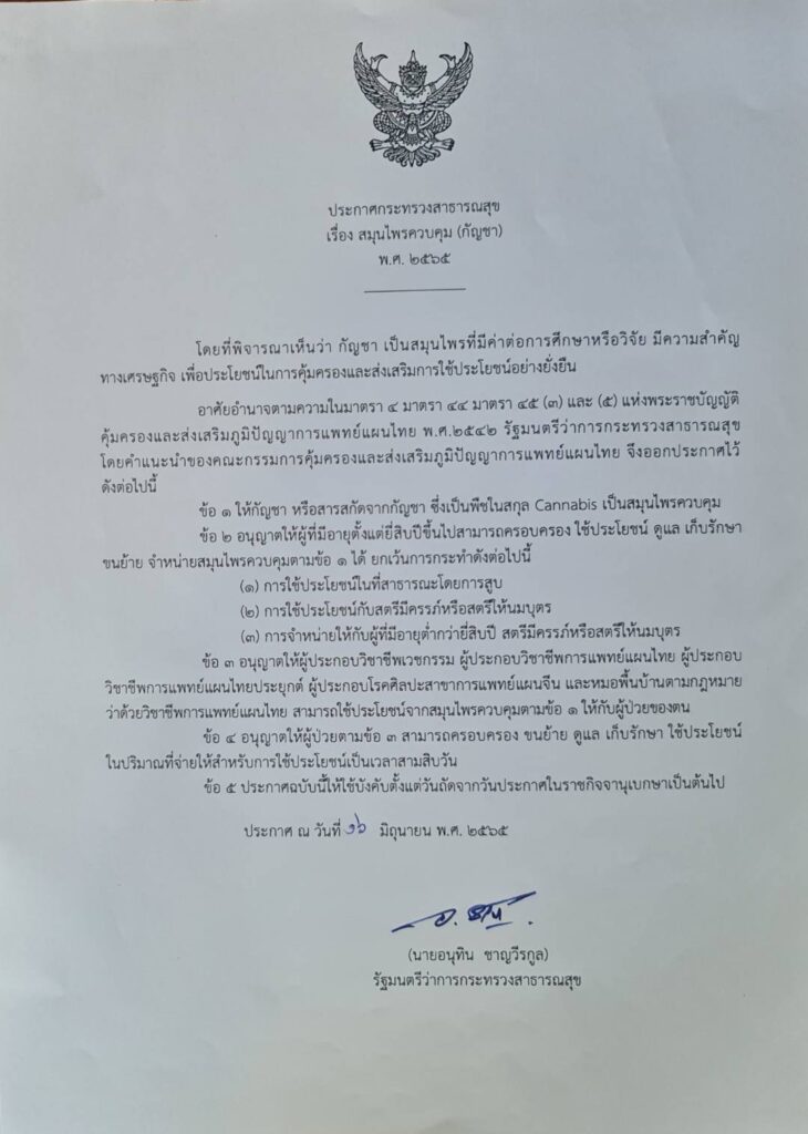 นายอนุทิน ชาญวีรกูล รองนายกรัฐมนตรีและรัฐมนตรีว่าการกระทรวงสาธารณสุข ได้ลงนามในประกาศกระทรวงสาธารณสุขเรื่อง สมุนไพรควบคุม(กัญชา) พ.ศ 2565 โดยที่พิจารณาเห็นว่า กัญชา เป็นสมุนไพรที่มีค่าต่อการศึกษาหรือวิจัยมีความสำคัญทางเศรษฐกิจ เพื่อประโยชน์ในการคุ้มครองและส่งเสริมการใช้ประโยชน์อย่างยั่งยืน