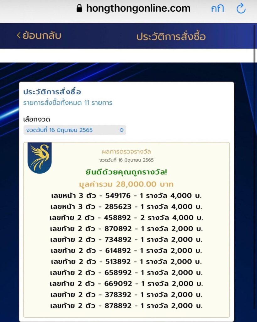 ซึ่งผลปรากฏว่างวดนี้ไม่โบ๋จ้า! ลอตเตอรี่ที่ซื้อมาจาก 628 ใบ ถูกรางวัลเลขหน้า 3 ตัว 549และ 285 จำนวน 2 ใบ และยังถูกรางวัลเลขท้าย 2 ตัว 92 จำนวน 11 ใบ รับทรัพย์เข้ากระเป๋าสวยๆรวยกรุบกริบ 28,000 บาท