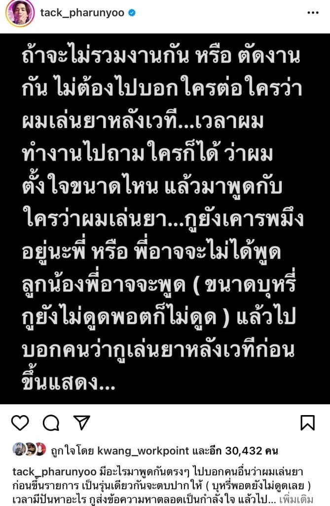 ล่าสุด “พชร์ อานนท์” ก็ได้โพสต์เดือดลงอินสตาแกรม ประกาศชัดว่า “อย่าเอาชื่อกูไปพาดพิงกับไอ้แทคอีก เพราะกูไม่เคยพูดเรื่องไอ้แทคเล่นยา ใครจะเป็นยังไง อย่าเอาชื่อกูไปเกี่ยว กูเบื่อเรื่องพวกนี้มาก เข้าใจนะ”