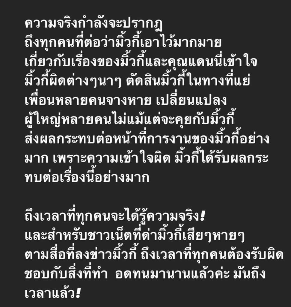 ณ.ตอนนี้ ขอให้ทุกคนรับทราบว่าคุณแดนนี่ก็มีคนอื่นแล้วเช่นกัน แค่ยังไม่กล้าที่จะพูดความจริงที่จะเปิดเผยต่อทุกคน และปล่อยให้ทุกคนเข้าใจมิ้วกี้ว่าผิดอยู่ฝ่ายเดียวมาตลอด วันนี้มิ้วกี้ได้เห็น ได้คุย ได้เคลียร์ตัวเองอย่างชัดเจนแล้ว และรู้สึกโล่งใจจนน้ำตาไหลออกมา ได้รู้ว่าชีวิตจากนี้ควรจะต้องเดินไปทางไหนต่อ ขอบคุณที่วันนี้ความจริงกระจ่างให้มิ้วกี้และทุกคนได้เห็น อยากขอบคุณแฟนๆทุกคนที่เข้าใจและให้กำลังใจมิ้วกี้เสมอมา