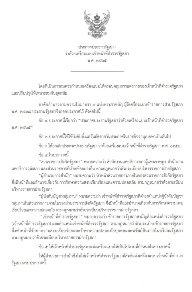 นายชวน หลีกภัย ประธานสภาผู้แทนราษฎร ได้ลงนามในประกาศประธานรัฐสภาว่าด้วยเรื่องเครื่องแบบเจ้าหน้าตำรวจรัฐสภา พ.ศ. 2565 เมื่อวันที่ 12 มิ.ย. ที่ผ่านมา โดยเห็นสมควรให้ปรับปรุงเครื่องแบบให้ครอบคลุมการแต่งกายของตำรวจรัฐสภาให้เหมาะสมกับยุคสมัย