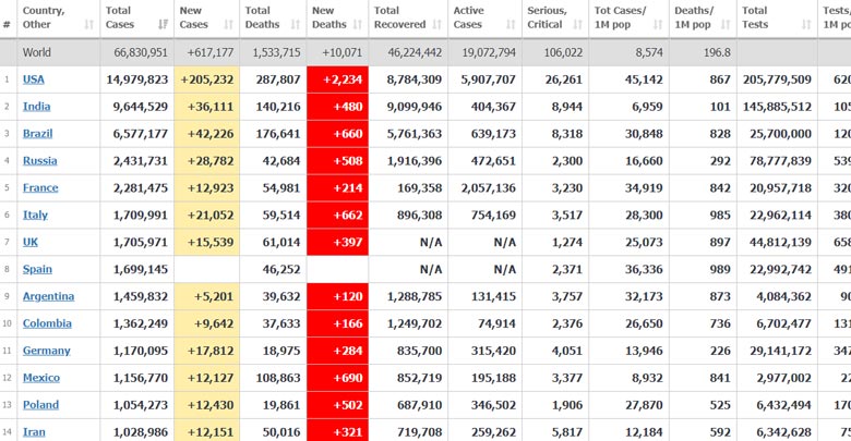 ประเทศที่พบรายงานผู้ติดเชื้อสูงสุด 5 อันดับแรก ได้แก่ 1.สหรัฐอเมริกา มีผู้ติดเชื้อ 14,979,823 ราย เพิ่มขึ้น 205,232 ราย เสียชีวิต 287,807 ราย เพิ่มขึ้น 2,234 ราย รักษาหาย 8,784,309 ราย 2.อินเดีย มีผู้ติดเชื้อ 9,644,529 ราย เพิ่มขึ้น 36,111 ราย เสียชีวิต 140,216 ราย เพิ่มขึ้น 480 ราย รักษาหาย 9,099,946 ราย 3.บราซิล มีผู้ติดเชื้อ 6,577,177 ราย เพิ่มขึ้น 42,226 ราย เสียชีวิต 176,641 ราย เพิ่มขึ้น 660 ราย รักษาหาย 5,761,363 ราย 4.รัสเซีย มีผู้ติดเชื้อ 2,431,731 ราย เพิ่มขึ้น 28,782 ราย เสียชีวิต 42,684 ราย เพิ่มขึ้น 508 ราย รักษาหาย 1,916,396 ราย 5.ฝรั่งเศส มีผู้ติดเชื้อ 2,281,475 ราย เพิ่มขึ้น 12,923 ราย เสียชีวิต 54,981 ราย เพิ่มขึ้น 214 ราย รักษาหาย 169,358 ราย