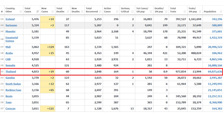 ส่วนประเทศไทยอยู่ในอันดับที่ 151 มีผู้ติดเชื้อ 4,072 ราย เพิ่มขึ้น 19 ราย เสียชีวิต 60 ราย รักษาหาย 3,848 ราย