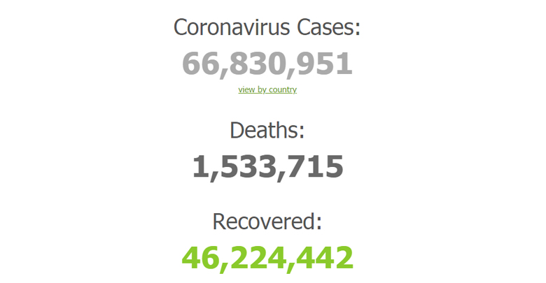 เว็บไชต์ Worldometers รายงานสถานการณ์ไวรัสโควิด-19 ประจำวันที่ 6 ธันวาคม 2563 ช่วงเวลาประมาณ 07.25 น. ตามเวลาประเทศไทย พบมีผู้ป่วยติดเชื้อทั่วโลก รวม 66,830,951 ราย เพิ่มขึ้น 617,177 ราย เสียชีวิต 1,533,715 ราย เพิ่มขึ้น 10,071 ราย รักษาหาย 46,224,442 ราย