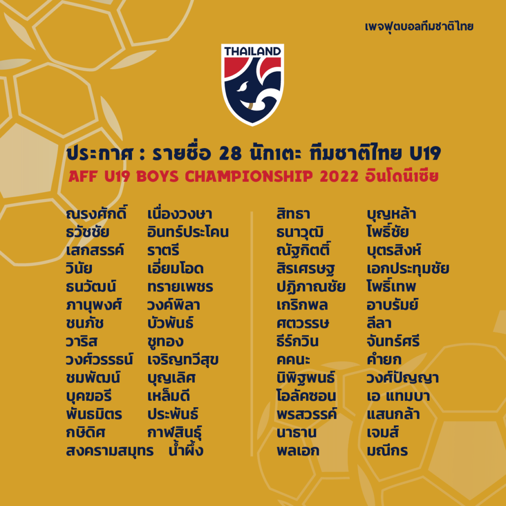 ทีมชาติไทย U19 เรียก 28 นักเตะ เก็บตัว และอุ่นเครื่อง 2 นัด ก่อนลุยชิงแชมป์อาเซียน 2022 ที่ประเทศอินโดนีเซีย