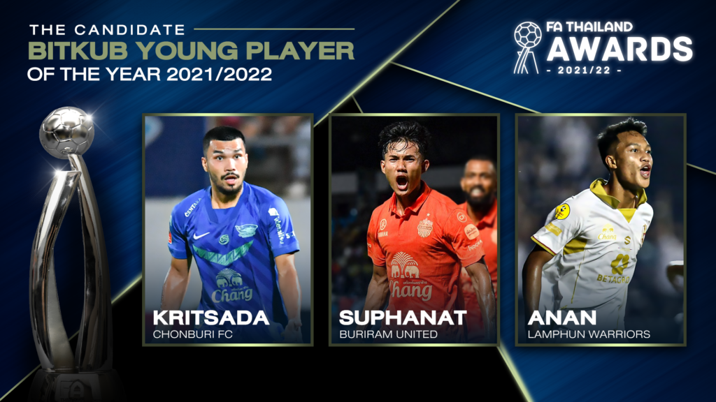 สมาคมกีฬาฟุตบอลแห่งประเทศไทยฯ เผยรายชื่อ 3 นักเตะที่มีชื่อเป็นแคนดิเดต ลุ้นคว้ารางวัล BITKUB YOUNG PLAYER OF THE YEAR 2021/22 ในงานประกาศเกียรติคุณ FA Thailand Awards 2021/22 แก่บุคคลผู้สร้างผลงานดีเด่นในวงการฟุตบอลไทยด้านต่างๆ ประจำปี 2021/22
