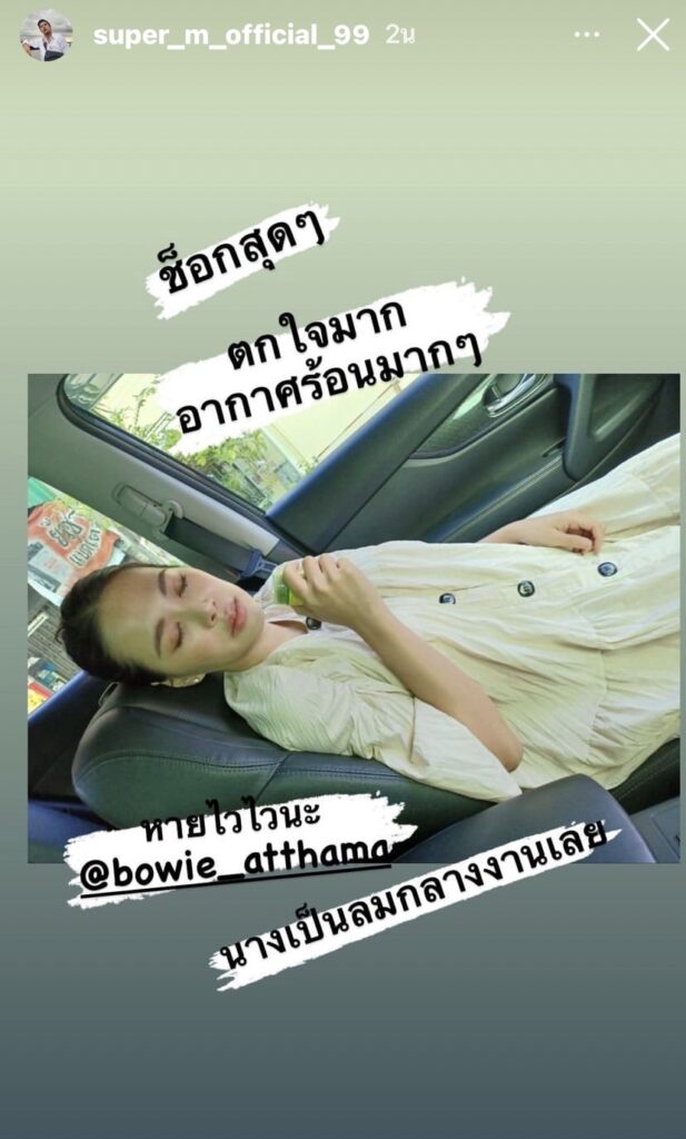 ล่าสุด “เอ็ม” ผู้จัดการส่วนตัวได้ลงรูป “โบวี่” ในไอจีสตอรี่ขณะนอนดมยาดมอยู่ในรถบอกว่า “ช็อกสุดๆ ตกใจมาก ขอให้หายไวๆ” นอกจากนี้ ผู้จัดการส่วนตัวยังออกมาเปิดใจว่าสาเหตุมาจาก “อากาศที่ร้อนมากวันนี้ และช่วงนี้ สาวโบวี่ กลับมารับงานเยอะเหมือนเดิม หลังจากสถานการณ์โควิดดีขึ้น”