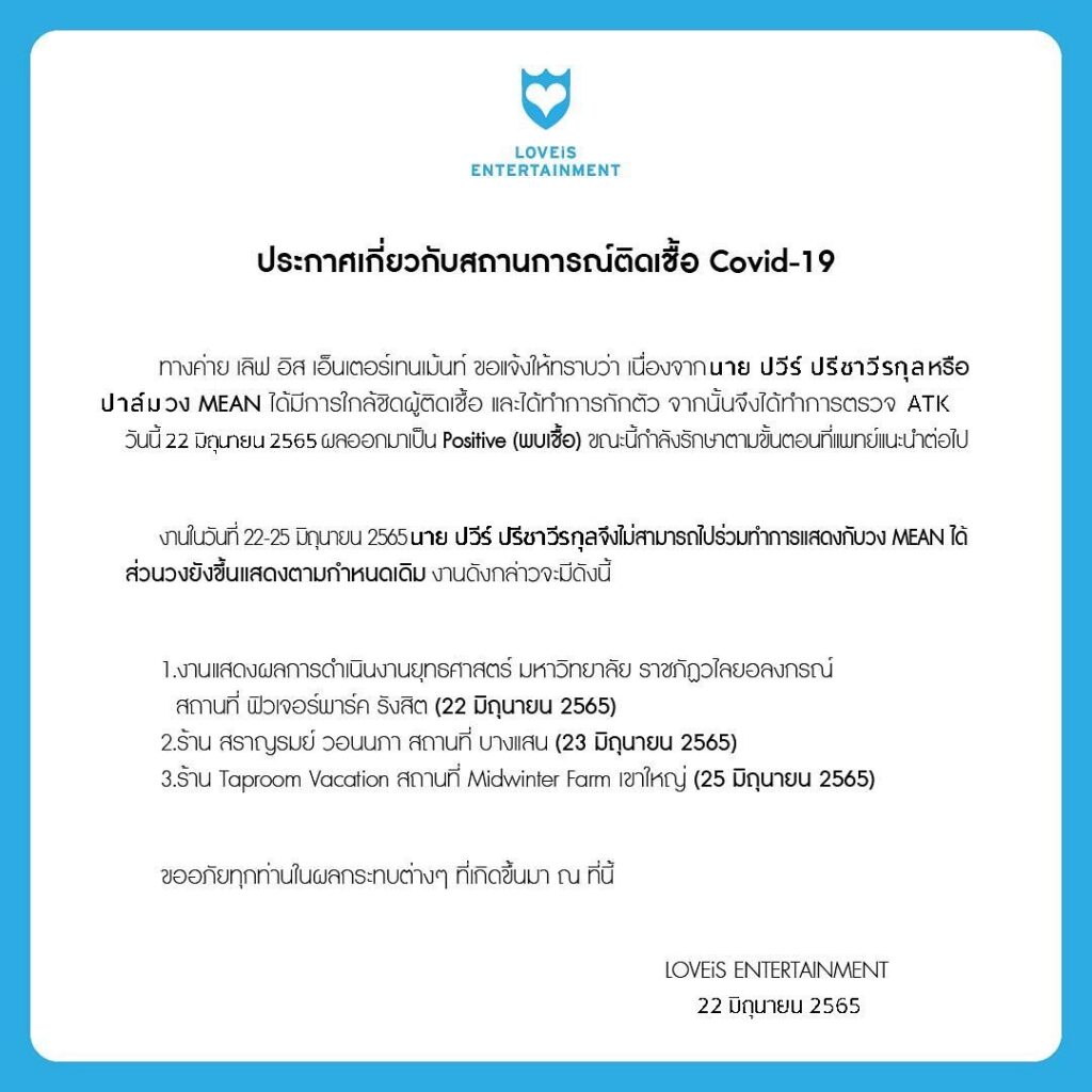 “ประกาศเกี่ยวกับสถานการณ์ติดเชื้อ Covid-19 ทางค่าย เลิฟ อิส เอ็นเตอร์เทนเม้นท์ ขอแจ้งให้ทราบว่า เนื่องจากนาย ปวีร์ ปรีชาวีรกุล หรือ ปาล์ม วง MEAN ได้มีการใกล้ชิดผู้ติดเชื้อ และได้ทำการกักตัว จากนั้นจึงได้ทำการตรวจ ATK วันนี้ 22 มิถุนายน 2565 ผลออกมาเป็น Positive (พบเชื้อ) ขณะนี้กำลังรักษาตามขั้นตอนที่แพทย์แนะนำต่อไป ซึ่งงานในวันที่ 22-25 มิถุนายน 2565 นาย ปวีร์ ปรีชาวีรกุล จึงไม่สามารถไปร่วมทำการแสดงกับวง MEAN ได้ ส่วนวงยังขึ้นแสดงตามกำหนดเดิม ขออภัยทุกท่านในผลกระทบต่าง ๆ ที่เกิดขึ้นมา ณ ที่นี้”