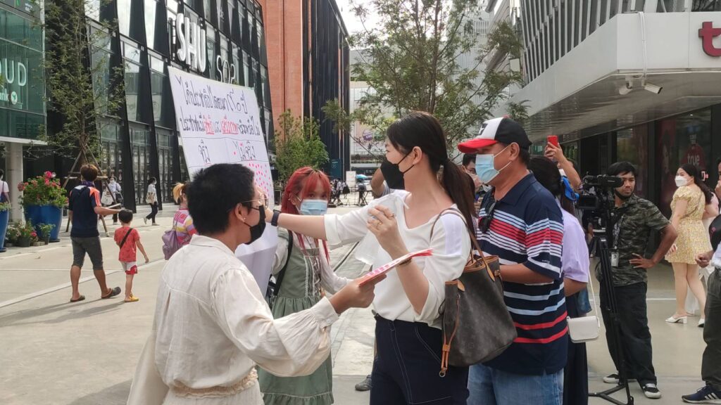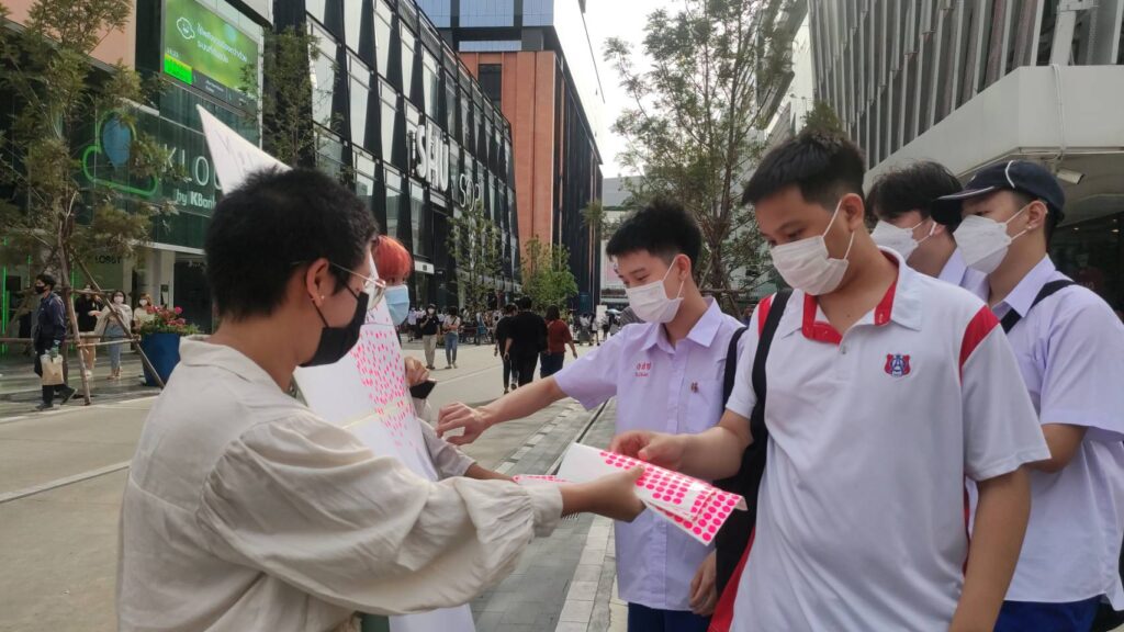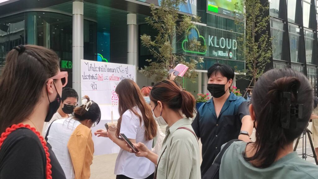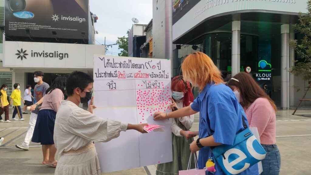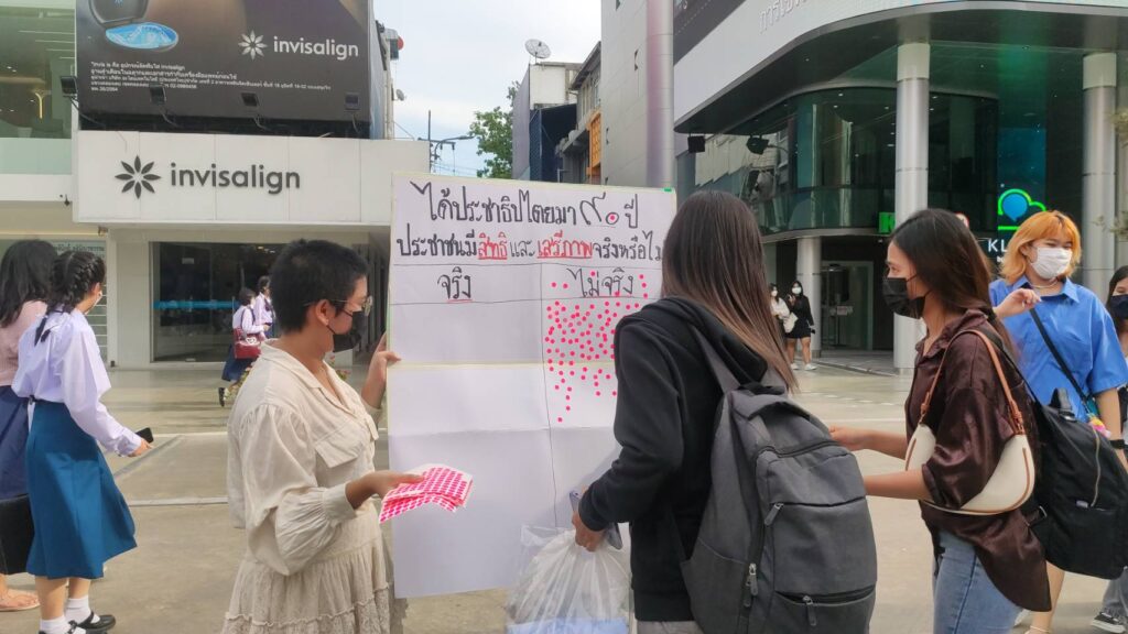โดยกิจกรรมจะเป็นป้ายคำถาม90 ปีประชาธิปไตย คิดว่าประชาชนมีสิทธิและเสรีภาพจริงหรือไม่ ประชาชนที่เดินอยู่ในบริเวณนี้ร่วมกันแปะสติ๊กเกอร์แสดงความเห็น ทั้งนี้ภายหลังจากมีมาตรการผ่อนคลายการใส่หน้ากากตามความสมัครใจก็ยังไม่มีใครถอดหน้ากากในที่สาธารณะ