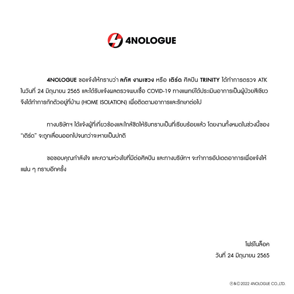 โดยต้นสังกัดได้ออกมาประกาศระบุข้อความว่า “4NOLOGUE ขอแจ้งให้ทราบว่า ลภัส งามเซวง หรือ เติร์ด ศิลปิน TRINITY ได้ทำการตรวจ ATK ในวันที่ 24 มิถุนายน 2565 และได้รับแจ้งผลตรวจพบเชื้อ COVID-19 ทางแพทย์ได้ประเมินอาการเป็นผู้ป่วยสีเขียว จึงได้ทำการกักตัวอยู่ที่บ้าน (HOME ISOLATION) เพื่อติดตามอาการและรักษาต่อไป”