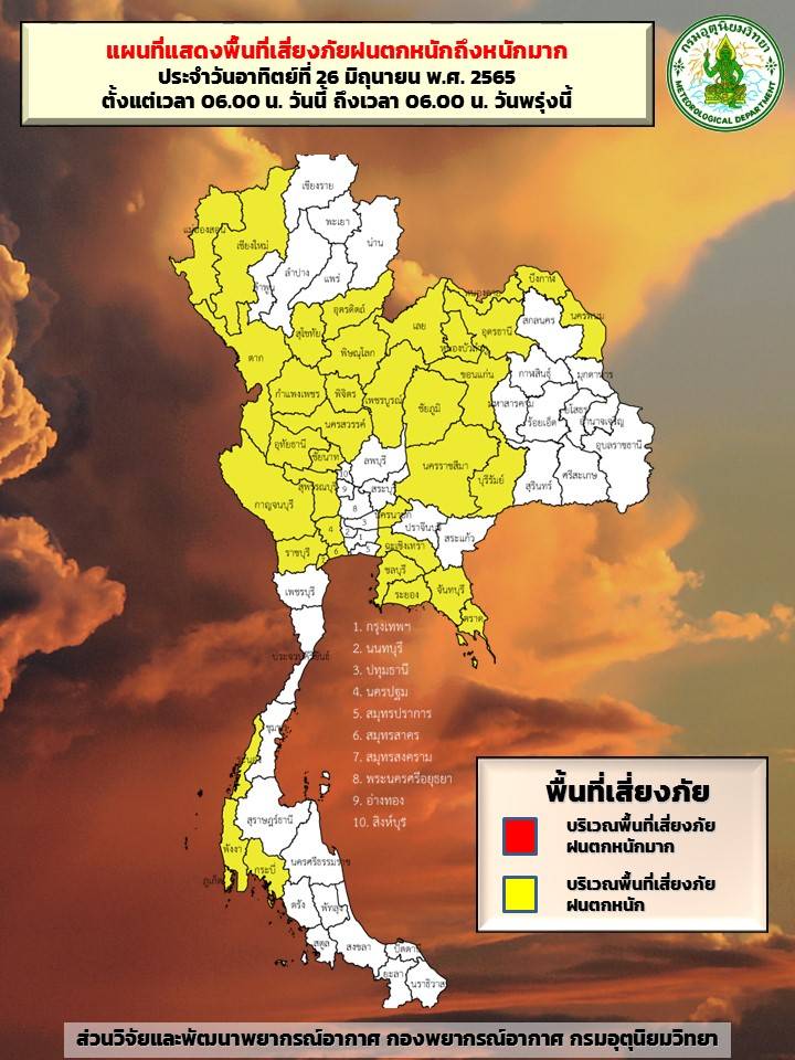 พยากรณ์อากาศประจำวันที่ 26 มิถุนายน 2565 ลักษณะอากาศ 24 ชั่วโมงข้างหน้า มรสุมตะวันตกเฉียงใต้พัดปกคลุมทะเลอันดามัน ประเทศไทย และอ่าวไทย ประกอบกับลมใต้และลมตะวันออกเฉียงใต้พัดปกคลุมภาคเหนือตอนล่าง ภาคตะวันออกเฉียงเหนือ ภาคกลาง และภาคตะวันออก