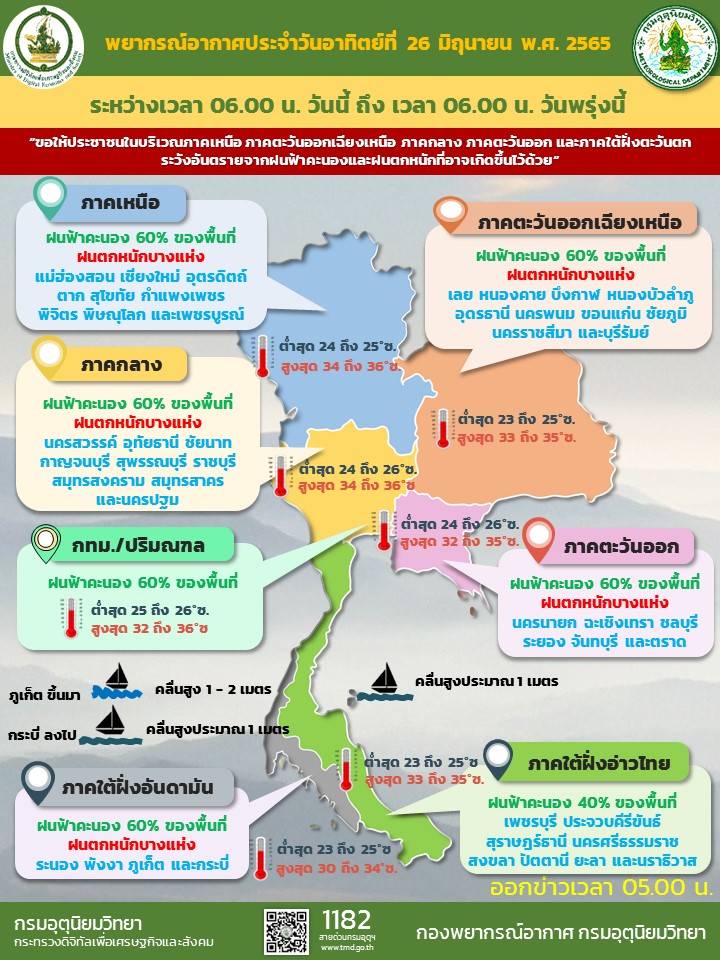 พยากรณ์อากาศประจำวันที่ 26 มิถุนายน 2565 ลักษณะอากาศ 24 ชั่วโมงข้างหน้า มรสุมตะวันตกเฉียงใต้พัดปกคลุมทะเลอันดามัน ประเทศไทย และอ่าวไทย ประกอบกับลมใต้และลมตะวันออกเฉียงใต้พัดปกคลุมภาคเหนือตอนล่าง ภาคตะวันออกเฉียงเหนือ ภาคกลาง และภาคตะวันออก