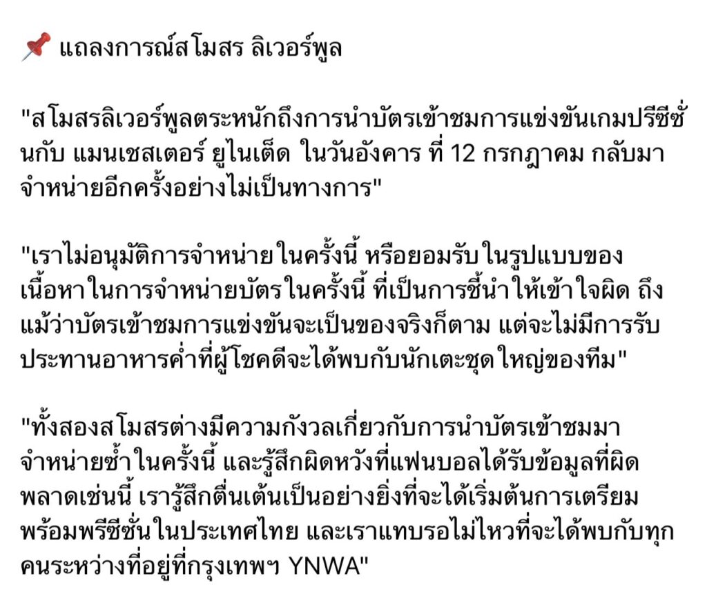 “สโมสรลิเวอร์พูล ตระหนักถึงการนำบัตรเข้าชมการแข่งขันเกมพรีซีซั่นกับแมนเชสเตอร์ ยูไนเต็ด ในวันอังคาร ที่ 12 กรกฎาคม กลับมาจำหน่ายอีกครั้งอย่างไม่เป็นทางการ