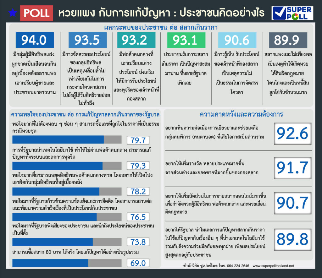 SUPERโพล เผย ประชาชนพอใจรัฐบาลแก้ปัญหาหวยแพง หวังเห็นความต่อเนื่องช่วยคนพิการเสียโอกาส แนะใช้เป็นโมเดลทำเรื่องอื่นด้วย
