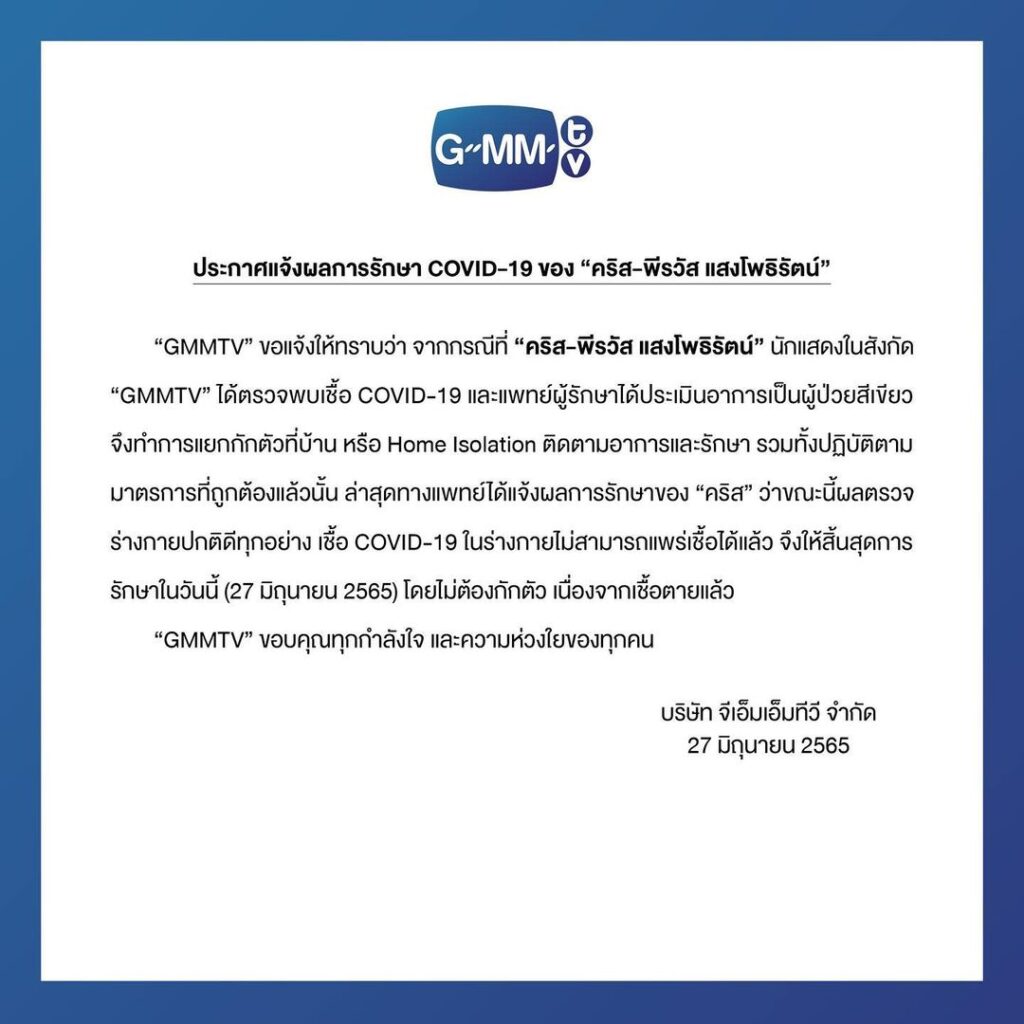 “ประกาศแจ้งผลการรักษา COVID-19 ของ “คริส-พีรวัส แสงโพธิรัตน์””GMMTV” ขอแจ้งให้ทราบว่า จากกรณีที่ “คริส-พีรวัส แสงโพธิรัตน์” นักแสดงในสังกัด “GMMTV” ได้ตรวจพบเชื้อ COVID-19 และแพทย์ผู้รักษาได้ประเมินอาการเป็นผู้ป่วยสีเขียว จึงทำการแยกกักตัวที่บ้าน หรือ Home Isolation ติดตามอาการและรักษา รวมทั้งปฏิบัติตามมาตรการที่ถูกต้องแล้วนั้น