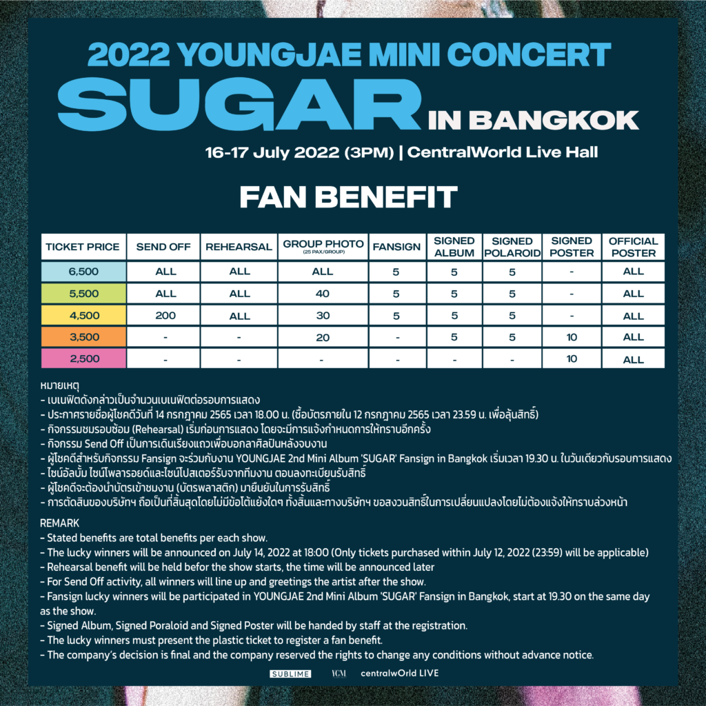 หลังจากที่ศิลปินหนุ่มเสียงทรงพลังอย่าง ยองแจ ได้คัมแบ็คโซโล่เดี่ยวด้วยมินิอัลบั้มที่ 2 กับการปล่อยซิงเกิ้ลเพลง “SUGAR” มาให้แฟนๆ ได้ติดตามกัน ล่าสุดก็มีการประกาศมินิคอนเสิร์ตทัวร์ ของหนุ่ม “ยองแจ” ที่ทำเอาเหล่าอากาเซ่ทั้งตื่นเต้น และรอคอยที่จะชมมินิคอนเสิร์ตแบบเต็มรูปแบบครั้งแรกของยองแจในครั้งนี้ และในที่สุด อากาเซ่ชาวไทยแดนเมียหลวงก็ไม่ต้องรอคอยกันแล้วเพราะทุกคนกำลังจะได้ชมความสนุก พร้อมเพลิดเพลินไปกับเสียงเพลง และเสียงร้องของยองแจ รวมทั้งยังได้ใกล้ชิดกับหนุ่มยองแจกันอีกด้วย กับงาน 2022 YOUNGJAE Mini Concert ‘Sugar’ in Bangkok ที่จะจัดขึ้นในวันเสาร์ที่ 16 และอาทิตย์ที่ 17 กรกฎาคม 2565 เวลา 15.00 น. ณ Central World Live Hall บัตรราคา 6500/5500/4500/3500/2500 ขายบัตรผ่านทาง www.yglobal-music.com เริ่มเปิดขายบัตรในวันศุกร์ที่ 1 กรกฎาคม 2565 ตั้งแต่เวลา 18.00 น. เป็นต้นไป