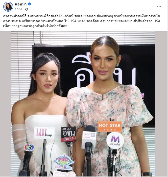 ล่าสุด แอนนา ได้โพสต์เผยความรู้สึกผ่านเฟซบุ๊กส่วนตัวว่า “อำลาหน้าจอทีวี จบบทบาทพิธีกรแล้วตั้งแต่วันนี้ รักและขอบคุณช่อง 8 มากๆ จากนี้ขอตามความฝันทำงานในต่างประเทศ เตรียมพาลูก พาแมวทั้งหมด ไป USA นะคะ รอคดีจบ” ท่ามกลางแฟนๆเข้ามาคอมเม้นต์ร่วมส่งกำลังใจให้กับแอนนาเป็นจำนวนมาก
