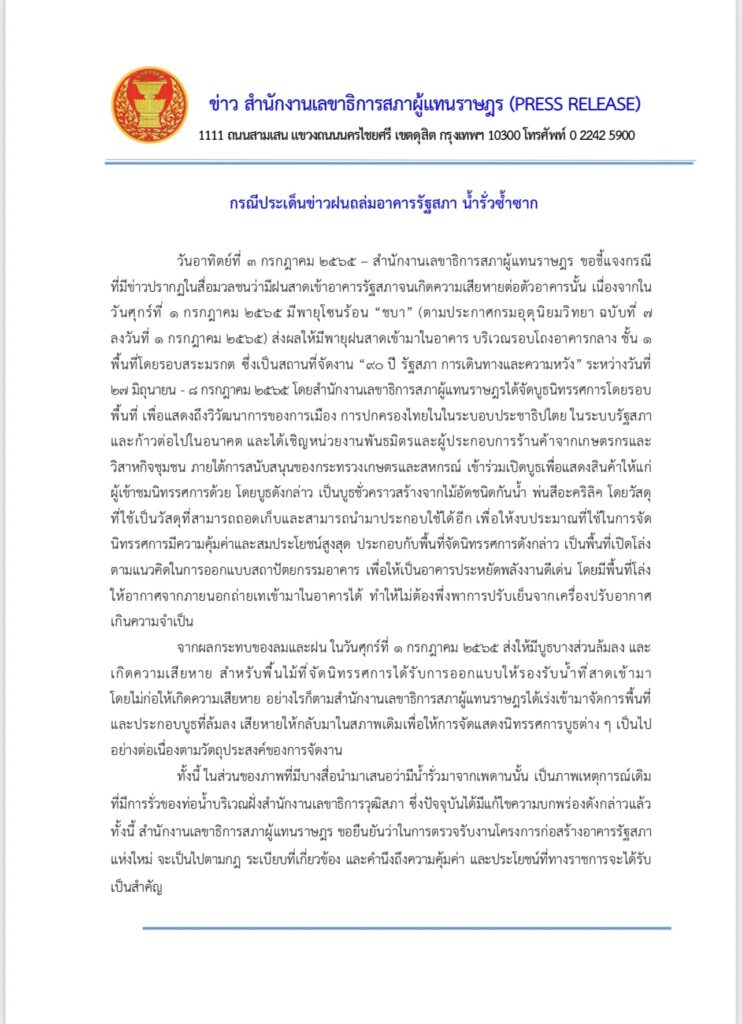 สํานักงานเลขาธิการสภาผู้แทนราษฎร ได้ออกเอกสารชี้แจงกรณีที่มีการแชร์ภาพ ฝนถล่มอาคารรัฐสภา เมื่อวันที่1 ก.ค. ที่ผ่านมาจนทำให้บูธนิทรรศการ 90 ปี รัฐสภา ล้มระเนระนาด จนถูกตั้งคำถามถึงประสิทธิภาพในการก่อสร้างอาคารรัฐสภา ว่า