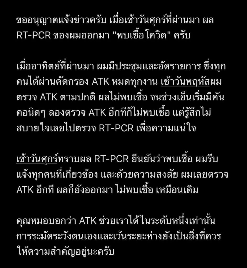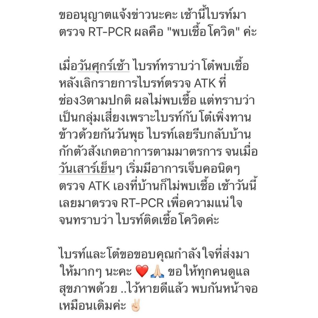 ล่าสุดทาง “ไบรท์ พิชญทัฬห์” ก็ไม่รอด ออกมาแจ้งข่าวติดเชื้อโควิด-19 พร้อมระบุข้อความว่า “ขออนุญาตแจ้งข่าวนะคะ เช้านี้ไบรท์มาตรวจ RT-PCR ผลคือ “พบเชื้อโควิด” ค่ะ เมื่อวันศุกร์เช้า ไบรท์ทราบว่าโต๋พบเชื้อ หลังเลิกรายการไบรท์ตรวจ ATK ที่ช่อง3 ตามปกติ ผลไม่พบเชื้อ แต่ทราบว่าเป็นกลุ่มเสี่ยง เพราะไบรท์กับโต๋เพิ่งทานข้าวด้วยกันวันพุธ ไบรท์เลยรีบกลับบ้านกักตัวสังเกตอาการตามมาตรการ จนเมื่อวันเสาร์เย็นๆ เริ่มมีอาการเจ็บคอนิดๆ ตรวข ATK เองที่บ้านก็ไม่พบเชื้อ เช้าวันนี้เลยมาตรวจ RT-PCR เพื่อความแน่ใจจนทราบว่า ไบรท์ติดเชื้อโควิดค่ะ