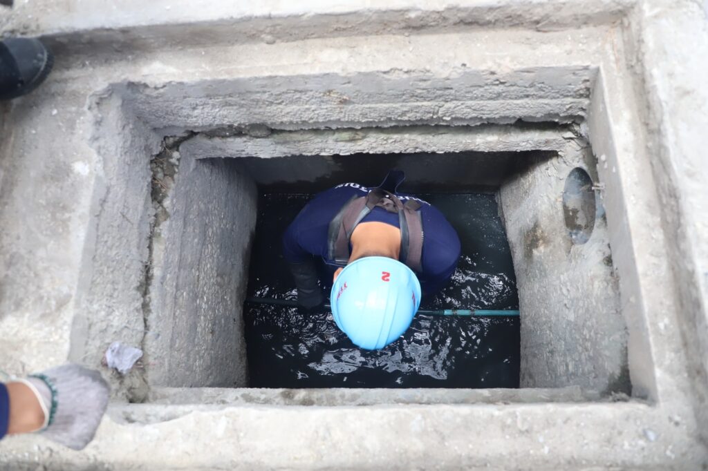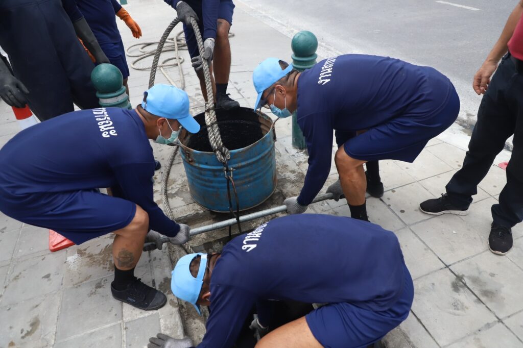 ส่วนท่อระบายน้ำที่มีการเปิดไว้เพื่อรอการลอกท่อในแต่ละช่วงก็จะมีการนำกรวยยางสีส้ม มาวางไว้เป็นสัญลักษณ์ ป้องกันคนที่เดินผ่านไปมาพลัดตกท่อระบายน้ำซึ่ง การลอกท่อตลอดช่วงเช้าที่ผ่านมา จะเจอเศษดินเลน เป็นจำนวนมาก และมี เศษขยะอีกจำนวนหนึ่ง โดย มีการจัดเก็บขึ้นรถบรรทุกไว้ทั้งหมดเพื่อเตรียมนำไปทิ้งในจุดทิ้งขยะ