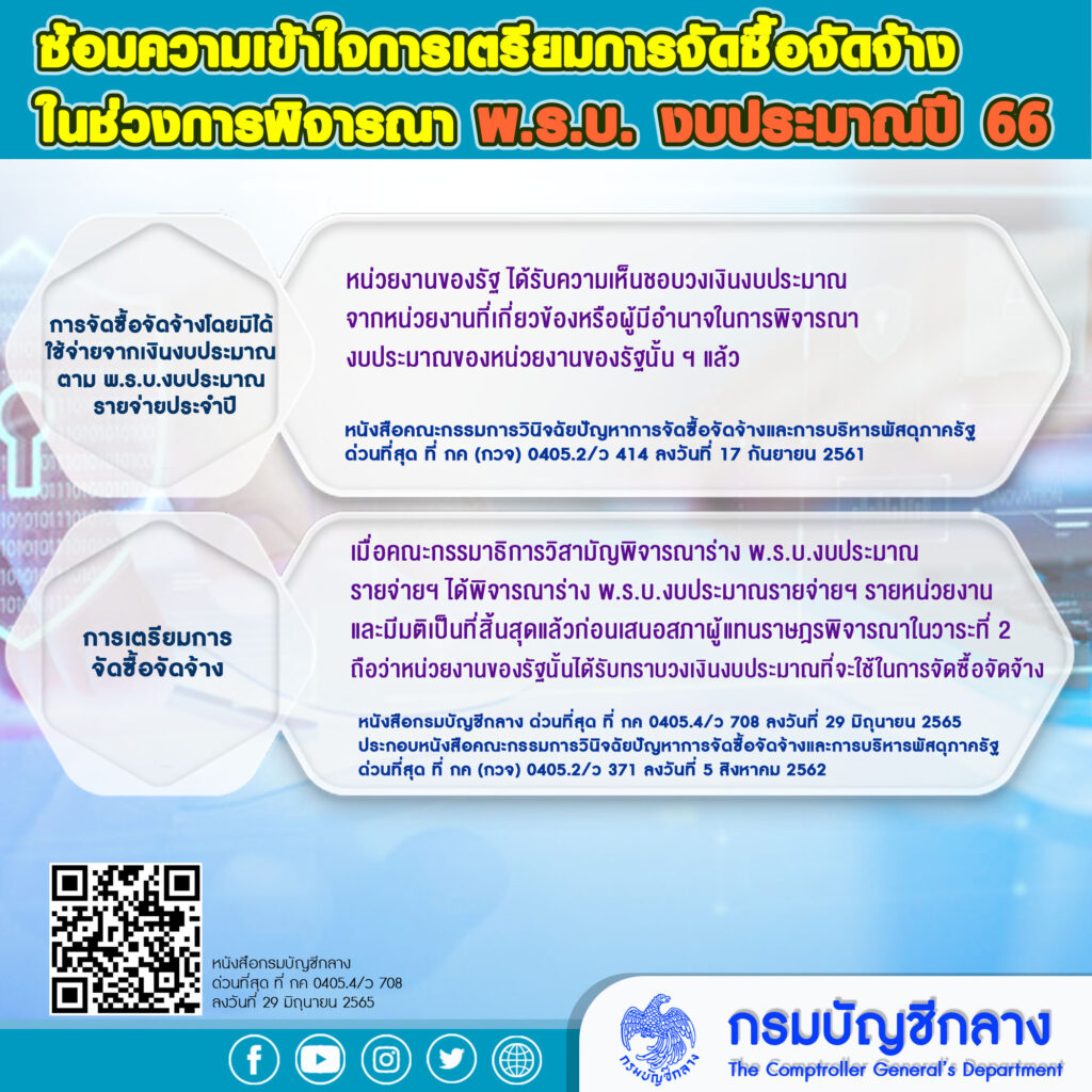และสอดคล้องกับนโยบายเร่งรัดการเบิกจ่ายเงินของรัฐบาล กรมฯ จึงได้แจ้งเวียนหนังสือกรมบัญชีกลาง ด่วนที่สุด ที่ กค 0405.4/ว 708 ลงวันที่ 29 มิถุนายน 2565 ซ้อมความเข้าใจให้หน่วยงานของรัฐถือปฏิบัติตามแนวทางปฏิบัติเกี่ยวกับการเตรียมการจัดซื้อจัดจ้าง ตามระเบียบกระทรวงการคลังว่าด้วยการจัดซื้อจัดจ้างและการบริหารพัสดุภาครัฐ พ.ศ. 2560 ตามหนังสือคณะกรรมการวินิจฉัยปัญหาการจัดซื้อจัดจ้างและการบริหารพัสดุภาครัฐด่วนที่สุด ที่ กค (กวจ) 0405.2/ว 371 ลงวันที่ 5 สิงหาคม 2562