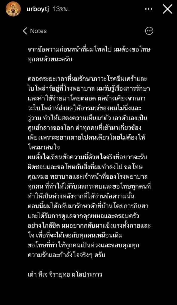 และขอโทษทุกคนที่ทำให้เป็นห่วงหลังจากที่ได้อ่านข้อความนั้น ตอนนี้ผมได้กลับมารักษาตัวที่บ้าน โดยการกินยา และได้รับการดูแลจากคุณหมอและครอบครัวอย่างใกล้ชิด ผมอยากกลับมาแข็งแรงทั้งกายและใจ เพื่อที่จะได้เจอกับทุกคนเหมือนเดิม ขอโทษที่ทำให้ทุกคนเป็นห่วงและขอบคุณทุกความรักและกำลังใจจริงๆ ครับ เต๋า ทีเจ จิรายุทธ ผโลประการ”