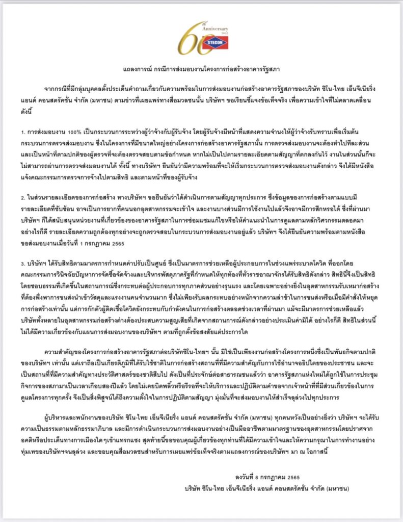 “จากกรณีที่มีกลุ่มบุคคลตั้งประเด็นคำถามเกี่ยวกับความพร้อมในการส่งมอบงานก่อสร้างอาคารรัฐสภาของบริษัท ซิโน-ไทย เอ็นจีเนียริ่ง แอนด์ คอนสตรัคชั่น จำกัด (มหาชน) ตามข่าวที่เผยแพร่ทางสื่อมวลชนนั้นบริษัทฯ ขอเรียนชี้แจงข้อเท็จจริง เพื่อความเข้าใจที่ไม่คลาดเคลื่อน ดังนี้