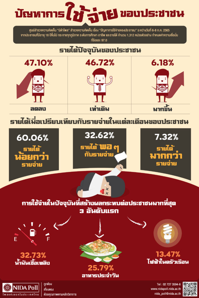 สถาบันบัณฑิตพัฒนบริหารศาสตร์ (นิด้า) เปิดเผยผลสำรวจของประชาชน เรื่อง “ปัญหาการใช้จ่ายของประชาชน” โดยทำการสำรวจระหว่างวันที่ 6-8 กรกฎาคม 2565 จากประชาชนที่มีอายุ 18 ปีขึ้นไปทั่วประเทศ จำนวน 1,312 หน่วยตัวอย่าง เมื่อถามถึงรายได้ปัจจุบันของประชาชน พบว่า ตัวอย่าง ร้อยละ 47.10 ระบุว่า รายได้ลดลง รองลงมา ร้อยละ 46.72