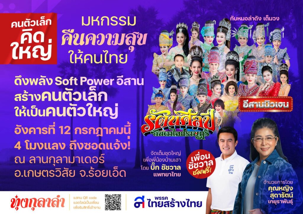 พรรคไทยสร้างไทย ชวนร่วมงาน “มหกรรมคืนความสุข” ให้คนไทย ภายใต้แนวคิด “คนตัวเล็ก…คิดใหญ่” สร้างคนตัวเล็กให้เป็นคนตัวใหญ่ ชูSoft Power