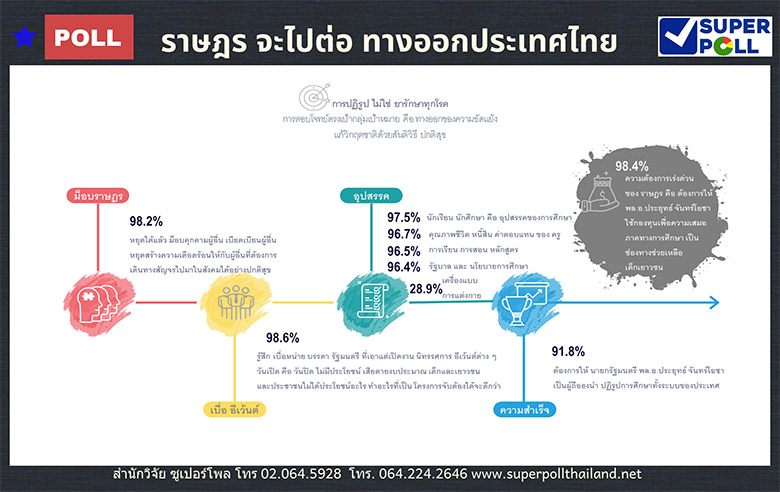 ซูเปอร์โพล (SUPER POLL) เผยผลสำรวจความคิดเห็นประชาชนทั่วประเทศ จำนวน 2,108 ตัวอย่าง เรื่องราษฎร จะไปต่อ ทางออกประเทศไทย ทำการสำรวจระหว่างวันที่ 1 – 5ธันวาคม พ.ศ. 2563 เมื่อถามถึง ความเห็นของราษฎร เรื่อง การหยุดม็อบคุกคามผู้อื่น หยุดเบียดเบียนผู้อื่น หยุดสร้างความเดือดร้อนให้กับผู้อื่นที่ต้องการเดินทางสัญจรไปมา พบว่า ส่วนใหญ่หรือร้อยละ 98.2 ระบุ หยุดได้แล้ว ในขณะที่เพียงร้อยละ 1.8 ระบุว่า ทำต่อไป อย่างไรก็ตาม เมื่อถามถึงความรู้สึกเบื่อหน่ายของราษฎร ผลสำรวจพบว่า ส่วนใหญ่หรือร้อยละ 98.6 รู้สึกเบื่อหน่าย บรรดารัฐมนตรีที่เอาแต่เปิดงาน นิทรรศการ วันเปิดคือวันปิด เสียดายงบประมาณ ประชาชนไม่ได้ประโยชน์ ควรทำอะไรที่เป็นโครงการที่เด็กและเยาวชนและประชาชนจับต้องได้จะดีกว่า เมื่อถามถึง ความต้องการของราษฎร เรื่อง ที่เป็นประโยชน์เรื่องแรก คือ นายกรัฐมนตรี พล.อ.ประยุทธ์ จันทร์โอชา ควรเป็นผู้ถือธงนำปฏิรูปการศึกษา ทั้งระบบของประเทศ พบว่า ส่วนใหญ่หรือร้อยละ 91.8 ระบุต้องการให้ นายกรัฐมนตรี พล.อ.ประยุทธ์ จันทร์โอชา เป็นผู้ถือธงนำปฏิรูปการศึกษาทั้งระบบของประเทศ ในขณะที่ เพียงร้อยละ 8.2 ไม่ต้องการ เมื่อถามถึง ความเห็นของราษฎร ต่อ อุปสรรคของการศึกษา พบว่า ส่วนใหญ่หรือร้อยละ 97.5 ระบุ ตัวเด็ก นักเรียน นักศึกษา เอง คือ อุปสรรค รองลงมาคือ ร้อยละ 96.7 ระบุคุณภาพชีวิตของ ครู อาจารย์ ภาระหนี้สิน ค่าตอบแทนที่ไม่ดีพอ ร้อยละ 96.5 ระบุ การเรียนการสอน หลักสูตร ร้อยละ 96.4 ระบุ รัฐบาลและนโยบายด้านการศึกษา ร้อยละ 96.1 ระบุ ความไม่พร้อมของแต่ละโรงเรียน และสถานศึกษาแต่ละแห่ง ร้อยละ 96.0 ระบุ พ่อแม่ผู้ปกครอง คือ อุปสรรค ร้อยละ 94.2 ระบุ ตัวครู อาจารย์ ไม่มีความรู้ความสามารถพอ คุณภาพไม่ดีพอ ร้อยละ 93.8 ระบุ ม็อบและการยุยงปั่นกระแส สร้างทัศนคติและพฤติกรรมของเด็กเยาวชนเป็นอุปสรรค ในขณะที่ เพียงร้อยละ 28.9 เท่านั้นที่ระบุ การแต่งกาย เครื่องแบบนักเรียน นักศึกษา เป็นอุปสรรคของการศึกษามากถึงมากที่สุด ท้ายที่สุดเมื่อถามถึง ความต้องการเร่งด่วนของ ราษฎร ต่อ พล.อ.ประยุทธ์ จันทร์โอชา นายกรัฐมนตรี ในการใช้กองทุนเพื่อความเสมอภาคทางการศึกษา เป็นช่องทางช่วยเหลือเด็กยากจน แก้อุปสรรคของการศึกษา พบว่า ส่วนใหญ่หรือร้อยละ 98.4 ต้องการ ในขณะที่ เพียงร้อยละ 1.6 เท่านั้นที่ไม่ต้องการ