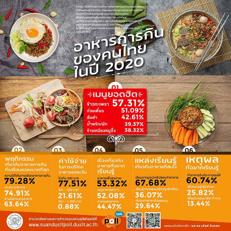 “สวนดุสิตโพล” มหาวิทยาลัยสวนดุสิต สำรวจความคิดเห็นของประชาชน เรื่อง “อาหารการกินของคนไทย ปี 2020” จำนวนทั้งสิ้น 1,144 คน ระหว่างวันที่1-3 ธันวาคม 2563 เพื่อสะท้อนความคิดเห็นของประชาชน เนื่องจากปีนี้มีเหตุการณ์ที่กระทบต่อการดำเนินชีวิตของคนไทยอย่างมาก ทั้งด้านเศรษฐกิจ การเมือง สังคม โดยเฉพาะอย่างยิ่งสถานการณ์โควิด-19 พบว่า กลุ่มตัวอย่างใสใจในการเลือกอาหารการกินมากขึ้น ร้อยละ 79.28 เมนูยอดฮิต ปี 2020 คือ ข้าวกะเพรา ร้อยละ 57.31 รองลงมาคือ ก๋วยเตี๋ยว ร้อยละ 51.09 ขณะเดียวกันมีค่าใช้จ่ายในการกินแต่ละวันไม่เกิน 300 บาท โดยมีสัดส่วน ร้อยละ 77.51 สำหรับเรื่องที่อยากเรียนรู้เกี่ยวกับอาหารคือ อาหารเพื่อสุขภาพ ร้อยละ 53.32 สนใจเรียนจากยูทูป/คลิปสอนทำอาหาร ร้อยละ 67.68 เพื่อจะได้ทำอาหารเองได้ ร้อยละ 60.74 ทั้งนี้ นางสาวพรพรรณ บัวทอง นักวิจัย สวนดุสิตโพล มหาวิทยาลัยสวนดุสิต ระบุว่า ปีนี้เป็นปีที่หนักหนาสาหัสมากปีหนึ่งของคนไทย ต้องใช้ชีวิตท่ามกลางสถานการณ์โควิด-19 การเมือง ที่ร้อนแรง รวมถึงสภาวะเศรษฐกิจตกต่ำ ส่งผลให้การกินอยู่ต้องระมัดระวังมากขึ้น ค่าใช้จ่ายก็ต้องควบคุม สุขภาพก็ต้องดูแล ต้องหันมาเรียนรู้การทำงานที่บ้านและการทำอาหารกินเอง ปัญหาจากสถานการณ์เหล่านี้ทำให้คนไทยเรียนรู้และปรับตัวอย่างรวดเร็ว ไม่ได้รอความช่วยเหลือจากมาตรการจากภาครัฐเพียงอย่างเดียว โดยสิ่งที่ยังทำให้มีความสุขทางใจได้บ้างก็คือ “อาหารการกิน” นั่นเอง ขณะที่อาจารย์จารึก ศรีอรุณ อาจารย์ผู้รับผิดชอบหลักสูตรอุตสาหกรรมการประกอบอาหาร โรงเรียนการเรือน มหาวิทยาลัยสวนดุสิต เปิดเผยว่า จากผลการสำรวจของสวนดุสิตโพล เห็นได้ว่าคนไทยมีพฤติกรรมการกินที่เปลี่ยนแปลงอย่างชัดเจน เนื่องด้วยสถานการณ์โควิด-19 ส่งผลกระทบโดยตรงต่อวิถีการดำเนินชีวิต เป็นสาเหตุที่ทำให้คนไทยหันมาใส่ใจการเลือกกินมากขึ้น ทั้งในเรื่องของความสะอาดของอาหาร แหล่งที่มาของวัตถุดิบและคุณค่าทางโภชนาการ เห็นได้จากการที่คนไทยนิยมเลือกกินอาหารสุขภาพมากขึ้น เป็นการดูแลสุขภาพ และยังช่วยประหยัดค่าใช้จ่ายในการกิน โดยเมนูยอดฮิตในปี 2020 คือ ผัดกะเพรา ซึ่งเป็นเมนูที่อร่อย สะดวก และทำง่าย มีวัตถุดิบเพียงไม่กี่อย่าง จึงทำให้ราคาไม่สูง คนไทยได้ปรับตัวและหันมาสนใจการทำอาหารกินเอง โดยการเรียนทำอาหาร ผ่านทางช่องทางออนไลน์ต่าง ๆ เพราะต้องใช้เวลาอยู่บ้านมากขึ้น การทำอาหารด้วยตนเอง จึงทำให้มั่นใจถึงความสะอาด และเป็นการใช้เวลาให้เกิดประโยชน์ เพิ่มทักษะและสามารถพัฒนาต่อไปได้ เพื่อสุขภาพที่ดีและชี