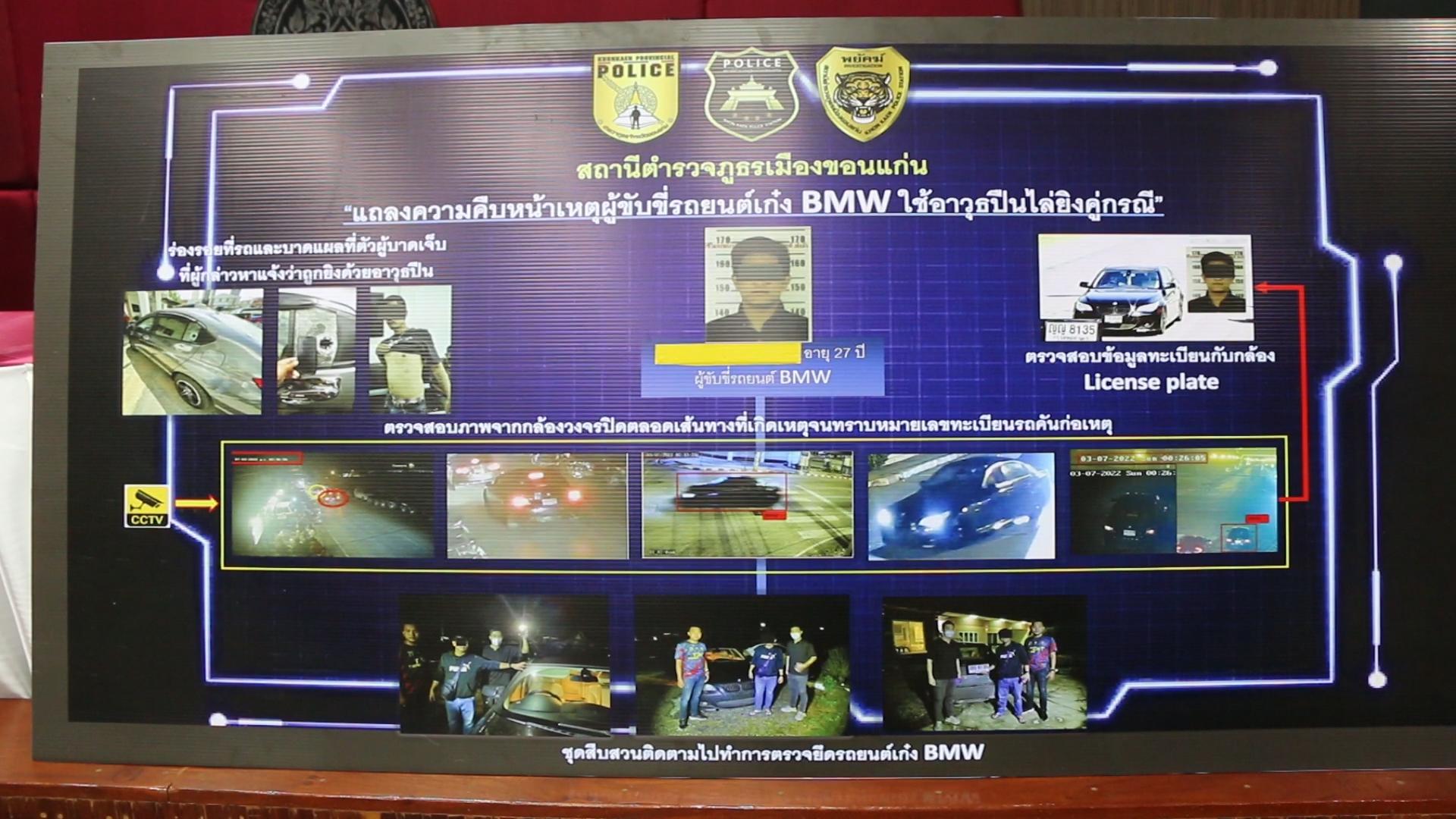 พล.ต.ต.นพเก้า กล่าวว่า ภายหลังจากเจ้าหน้าที่ตำรวจได้รับแจ้งเกิดเหตุคนร้ายขับรถยนต์ BMW สีดำ ไม่ติดทะเบียนด้านหน้า ขับรถไล่ยิง รถยนต์เก๋ง ฮอนด้าซิตี้ สีเทาดำ หมายเลขทะเบียน กม- 7065 กาญจนบุรี ที่มีนายสุกาน กมลสุรัตน์ อายุ 32 ปี เป็นเจ้าของรถและเป็นคนขับรถ ได้ขับรถออกจากสถานบันเทิงถนนรื่นรมย์ ในเขตเทศบาลนครขอนแก่นแต่ขับช้า รถ BMW สีดำที่ขับตามมา ไม่พอใจ ได้ไล่ยิง จำนวน 7 นัด กระสุนถูกนายธิติศร สุขสมบัติ อายุ 32 ปี เพื่อนที่นั่งเบาะหลัง ที่ใต้ราวนมฝั่งซ้าย ต่อมานายพิทยา ได้ขับรถ BMW มามอบตัวกับเจ้าหน้าที่ตำรวจสภ.เมืองขอนแก่น และยอมรับว่า ในคืนดังกล่าวได้ก่อเหตุจริง แต่ไม่ได้คิดจะฆ่าหรือทำร้ายใคร เพียงแค่ยิงข่มขู่เท่านั้น