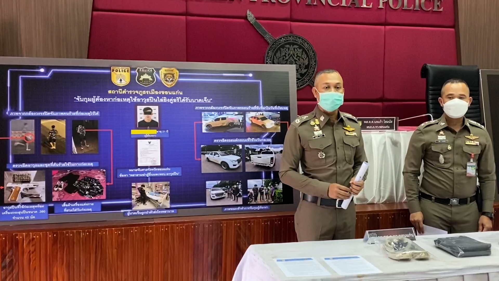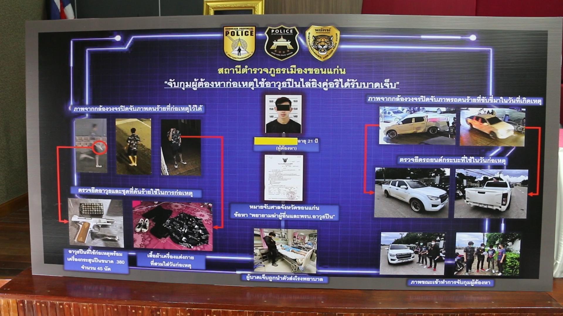 พล.ต.ต.นพเก้า โสมนัส ผบก.ภ.จว.ขอนแก่น พร้อมด้วย พ.ต.อ.ปรีชา เก่งสาริกิจ ผกก.สภ.เมืองขอนแก่น ร่วมกันแถลงผลการจับกุม นายพงษ์ศักดิ์ อายุ 25 ปี อยู่อ.หนองเรือ จ.ขอนแก่น ผู้ต้องหาตามหมายจับของศาลจังหวัดขอนแก่น ข้อหา พยายามฆ่า และพกพาอาวุธปืนไปในเมือง หมู่บ้าน โดยไม่ได้รับอนุญาต หลังก่อเหตุใช้อาวธปืน และ นายพิทยา อายุ 27 ปี อยู่ อ.เมือง จ.ขอนแก่น ในข้อหา พยายามฆ่า และพกพาอาวุธปืนไปในเมือง หมู่บ้าน โดยไม่ได้รับอนุญาต
