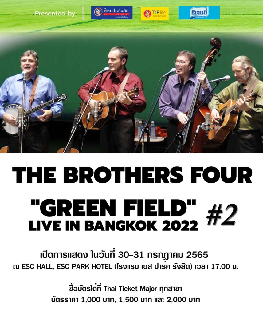 THE BROTHERS FOUR “GREEN FIELD” LIVE IN BANGKOK 2022จะจัดขึ้นในวันที่ 30 และ 31 กรกฎาคม2565 ณเอส ฮอลล์โรงแรม เอส พาร์คบัตรราคา 1,000 1,500 และ 2,000 บาท จองบัตรได้ที่ Thai Ticket Major ทุกสาขา หรือโทร 061-493 8229