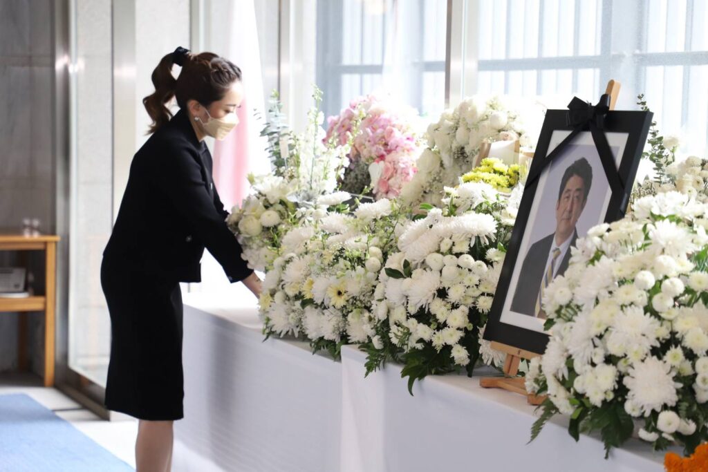 พรรคเพื่อไทยนำโดย นายประเสริฐ จันทรรวงทอง เลขาธิการ และ นางสาวแพทองธาร ชินวัตร ประธานคณะที่ปรึกษาด้านการมีส่วนร่วมและนวัตกรรมเดินทางมาที่สถานเอกอัครราชทูตญี่ปุ่นประจำประเทศไทยเพื่อลงนามไว้อาลัยนายชินโซ อาเบะ อดีตนายกรัฐมนตรีญี่ปุ่นที่ถึงแก่อสัญกรรม โดยมีนายนาชิดะ คาซูยะ เอกอัครราชทูตญี่ปุ่นประจำประเทศไทยให้การต้อนรับ