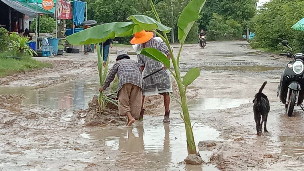 โดยชาวบ้าน ได้นำเอาต้นกล้วย ต้นกล้าข้าว ปักดำและปลูกลงไปในหลุมกลางถนน แถมคุณยายยังลงว่ายน้ำเล่นกลางถนน เพื่อประชดหน่วยงานที่รับผิดชอบถนน ซึ่งเป็นหลุมขนาดใหญ่มาก เขียนป้ายข้อความ